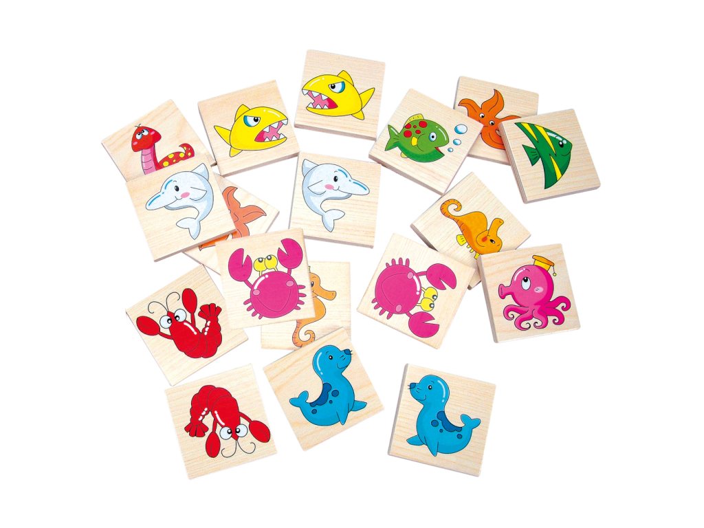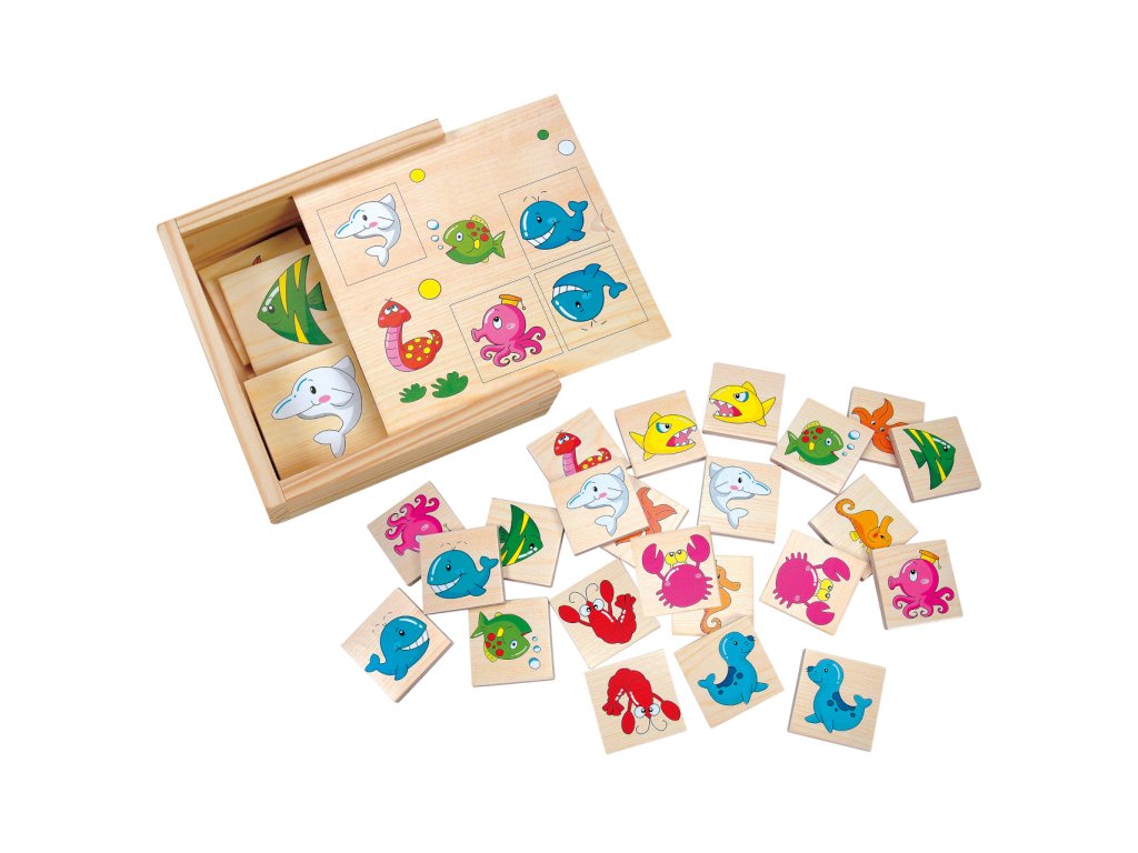 Díky pestrobarevným obrázkům roztomilých vodních zvířátek se hraje téměř samo. Pexeso je baleno v praktické krabičce s výsuvným víkem – vše vyrobeno z lehké, ale pevné překližky. Hlavní vlastnosti:krabička s víkem a 24 herních dílkůpraktické balení