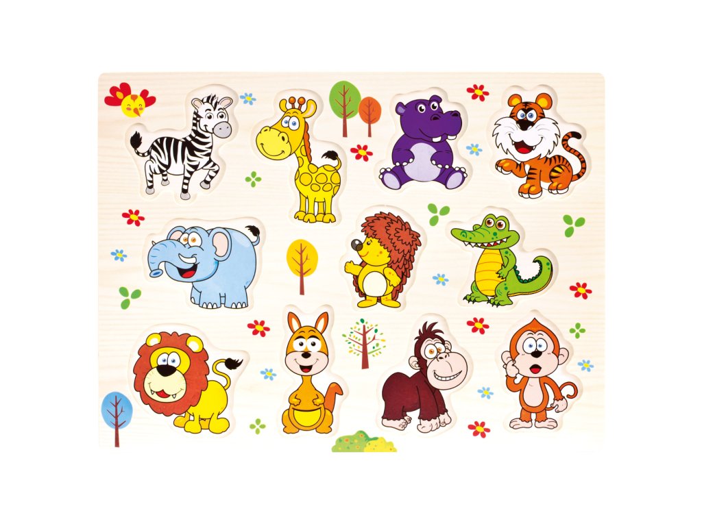 Velké puzzle na dřevěné desce s vkládacími ikonami zvířátek ze safari. Hra rozvíjí koordinaci rukou a zraku. Vyrobeno z odolné překližky. Hlavní vlastnosti:základna a 11 dílkůodolné dřevěné provedení