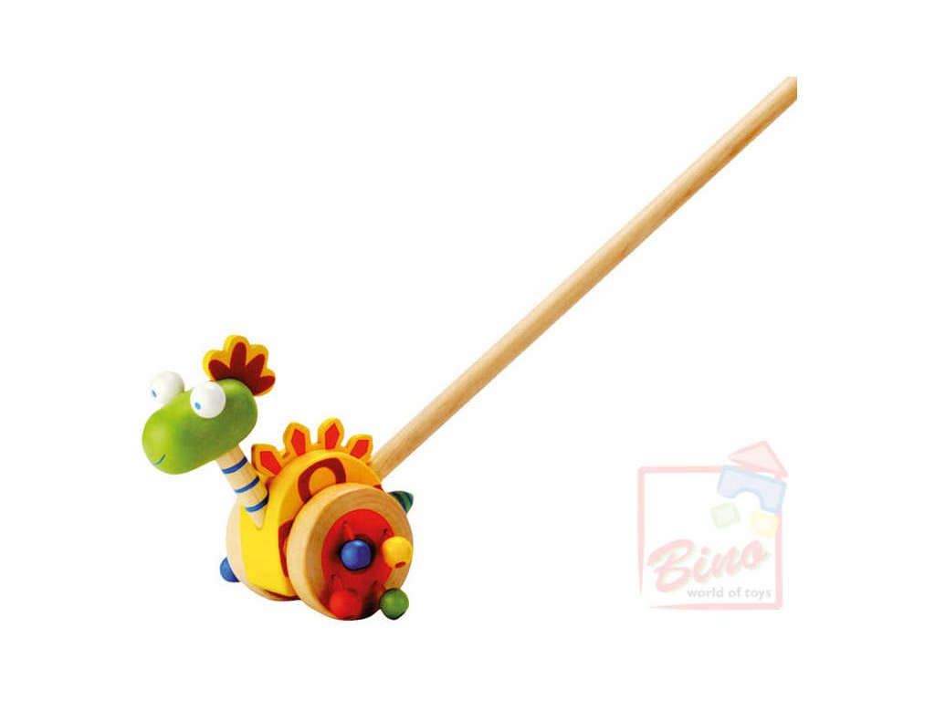 81671 Dětský dřevěný dinosaurus na tyči s barevnými korálky na kolečkách Bino