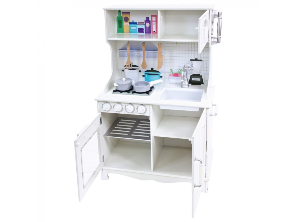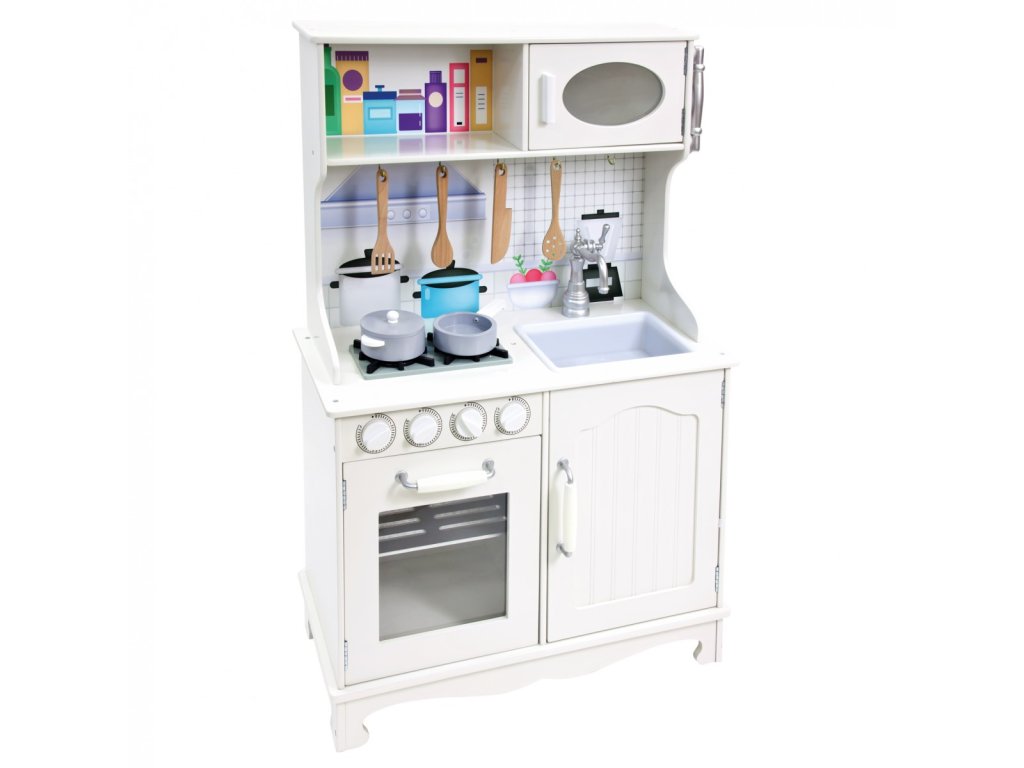 Dětská kuchyňka ve středomořském stylu, vybavená dřezem, sporákem a troubou včetně mikrovlnné. Sporák disponuje otočnými knoflíky, které dodají hrám Vašich dětí na autenticitě. Prostor nad linkou a pod dřezem skýtá objemné úložné prostory. Na pravém boku je umístěn telefon. Kuchyňka je dodávána včetně příslušenství, nádobí i náčiní. Hračka je robustní a odolná, vyrobena ze silné překližky a masivního dřeva. Hlavní vlastnosti:kuchyňka s telefonem, hrnec s poklicí, pánev, vařečka, obracečka, nůž a vidličkadřez, sporák, trouba a mikrovlnná troubaúložné prostoryrobustní dřevěné provedení