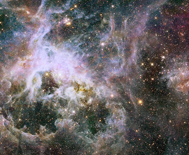 Mlhovina je ohniskem pro některé z nejžhavějších a nejhmotnějších hvězd, které astronomové znají, a uprostřed jiskřivé modři s masivními mladými hvězdami je hvězdokupa R136, její nejaktivnější oblast.