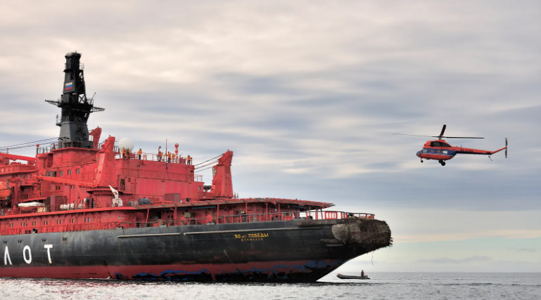 Když loď na cestě tam praskne ledový příkrov o tloušťce 3 m, zní to syrově a bez výhrad. Název lodi znamená v ruštině „50 let vítězství“ a odkazuje k 50. výročí triumfu Sovětského svazu ve druhé světové válce. Na památku svého startu přenesla loď v roce 2013 olympijský oheň na severní pól během příprav na zimní olympijské hry v Soči. Téměř 160 m dlouhý ledoborec, poháněný dvojicí 171megawattových jaderných reaktorů a dvěma 27,6megawattovými parními turbogenerátory, dokáže dosáhnout rychlosti 21,4 uzlů – téměř 40 km za hodinu – a plout bez přestávky téměř šest let, aniž by se musel vrátit na pevninu kvůli doplnění paliva. S jadernými reaktory na palubě se zastavení paliva stávají téměř minulostí.
