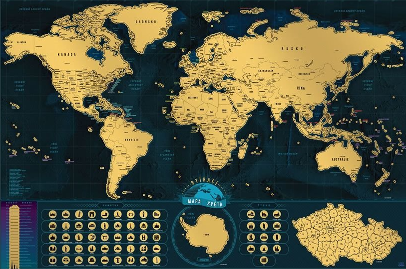Vynikající dárek pro cestovatele a dobrodruhy, kterým je stírací mapa. Pokud rádi cestujete jako pár nebo cestuje pouze váš přítel, tak rozhodně je tento dárek vhodný. Stírací plakát je v jednobarevné variantě, kdy má stírací plochy a po každém navštíveném státě si jej na mapě setřete což je velmi dekorativní a navždy máte na očích vzpomínku a přehled v tom jaké státy jste již navštívili.