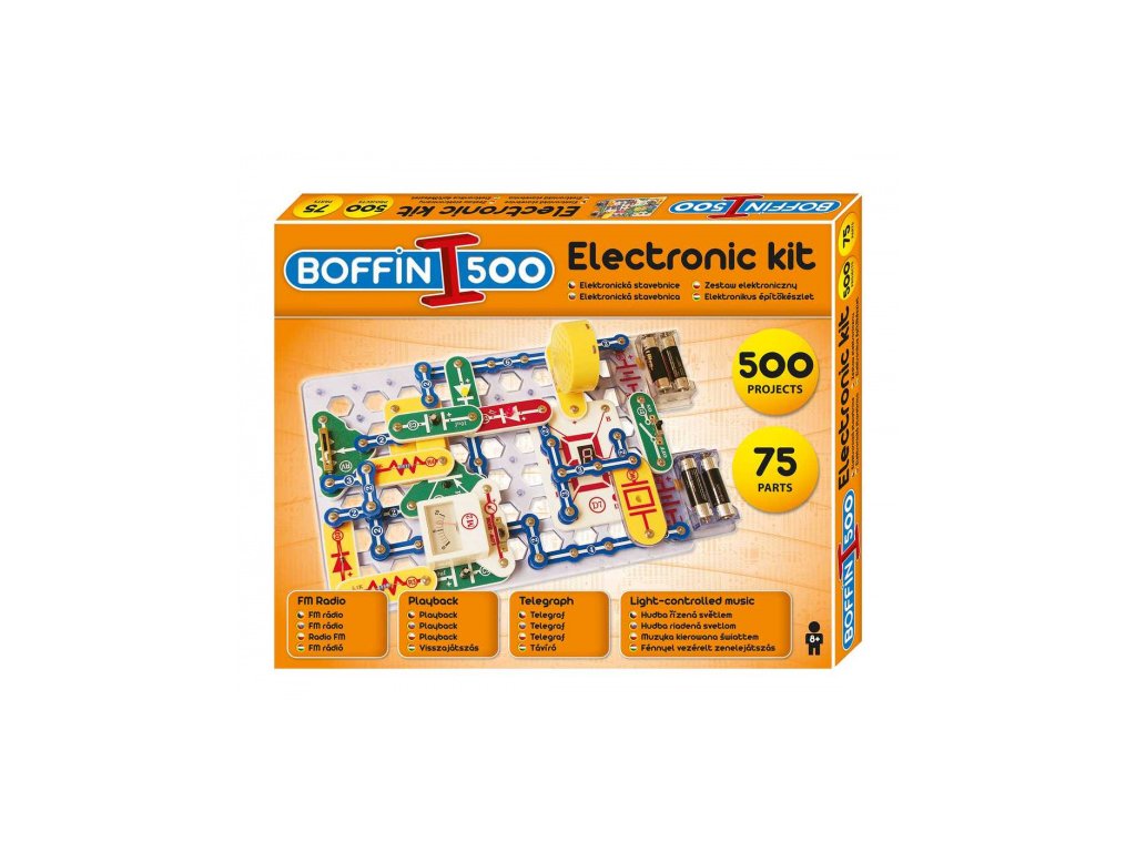 Elektronická stavebnice Boffin I 500 obsahuje 75 součástek, z nichž lze postavit nejméně 500 projektů.
