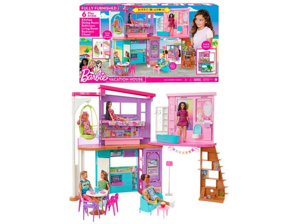 Tento Barbie® Párty dům v Malibu inspiruje k nekonečným hrám díky dvěma patrům a šesti hracím zónám včetně ložnice, koupelny, kuchyně, jídelny, obývacího pokoje a šatny. Děti se mohou rovnou nastěhovat a vyprávět jakýkoli příběh díky více než 30 předmětům, a to včetně zábavného vybavení, jako jsou židle, jídelní stůl s připojitelnou deskou a další. Zábavné detaily a moderní povrchové úpravy otevírají dveře všem druhům vyprávěcích her, stylová houpací židle se může pohybovat nahoru a dolů a sloužit jako výtah a celá sada se dá složit pro snadný úklid a přenášení. Panenky se prodávají samostatně. Barvy a vzhled výrobku se mohou lišit.