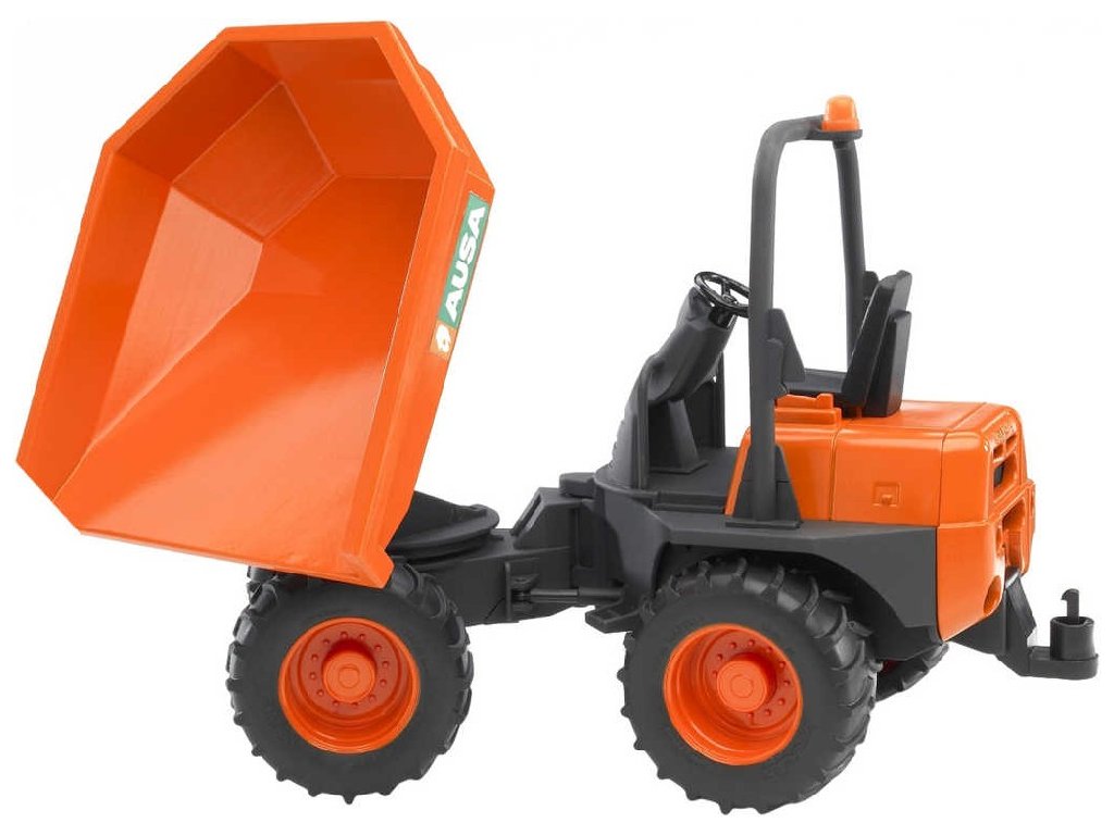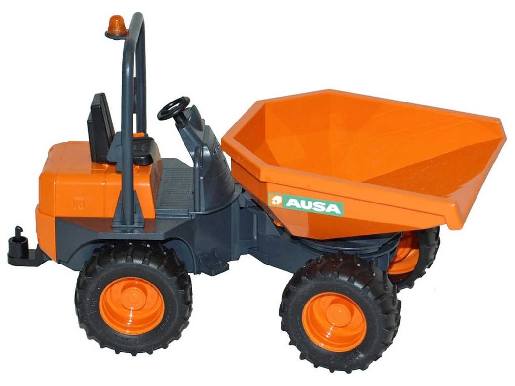 BRUDER 02449 - Minidumper AUSA - malý kolový stroj se sklápěcí ložnou plochou. Zatáčení pomocí kloubu ve středu vozidla. Odnímatelné závěsné zařízení. Vyrobeno jako věrná kopie opravdového vozu z velmi kvalitního ABS-plastu