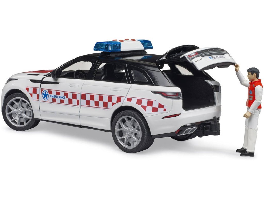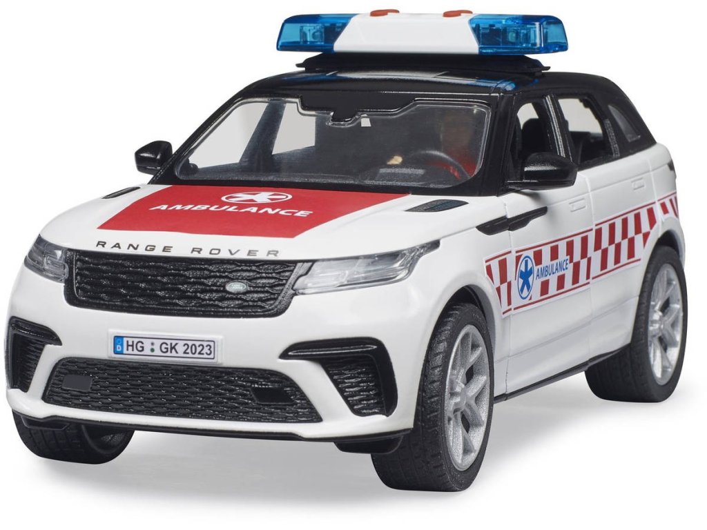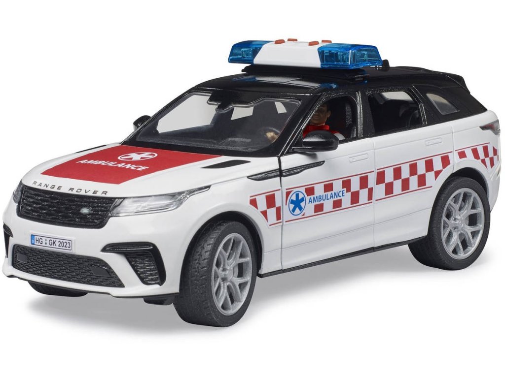 Range Rover Velar ambulance podporuje sanitní vozy, které jsou již součástí nabídky BRUDER. Velar spolehlivě mobilizuje pohotovostního lékaře, který je součástí dodávky. K tomu napomáhají terénní odpružené nápravy a prodloužený volant, který lze použít přes střešní poklop. Úložný prostor zajišťují 4 otevírací dveře a zadní dveře. Sanitní vůz Range Rover Velar je ideálním doplňkem k sanitnímu vozu MB Sprinter (2676) a ke zdravotní stanici bworld (62711).