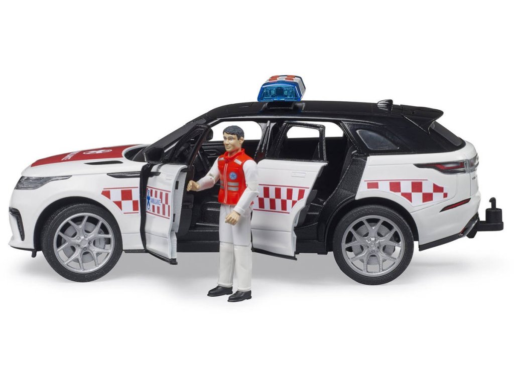 Range Rover Velar ambulance podporuje sanitní vozy, které jsou již součástí nabídky BRUDER. Velar spolehlivě mobilizuje pohotovostního lékaře, který je součástí dodávky. K tomu napomáhají terénní odpružené nápravy a prodloužený volant, který lze použít přes střešní poklop. Úložný prostor zajišťují 4 otevírací dveře a zadní dveře. Sanitní vůz Range Rover Velar je ideálním doplňkem k sanitnímu vozu MB Sprinter (2676) a ke zdravotní stanici bworld (62711).