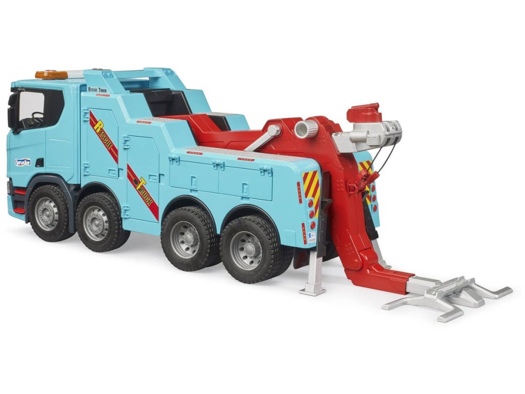 Ve společnosti BRUDER mohou nyní děti objevovat a znovu vytvářet tyto fascinující funkce na novém vyprošťovacím a odtahovém voze Scania Super 560R. Zvedák kol lze sklopit a pojme přední kola taženého vozidla. Za jednou z mnoha otevíracích klapek je umístěno výškové nastavení hlavního ramene, kterým lze hlavní rameno včetně vozidla zvednout. Na konci teleskopického hlavního ramene je umístěn lanový naviják.