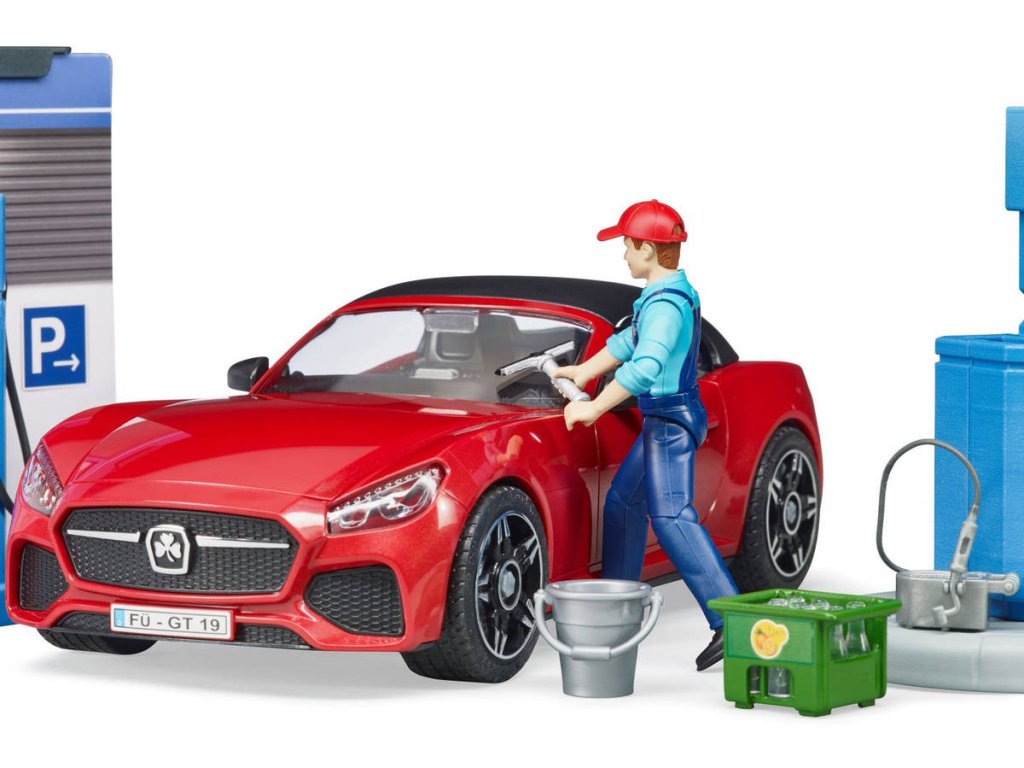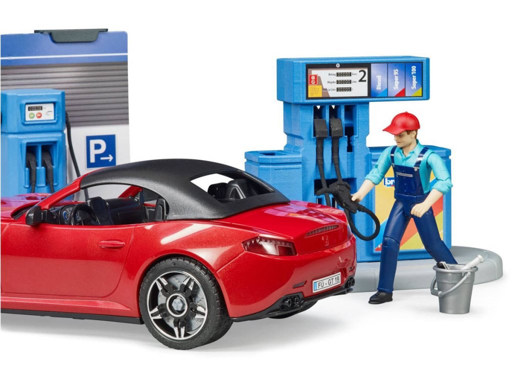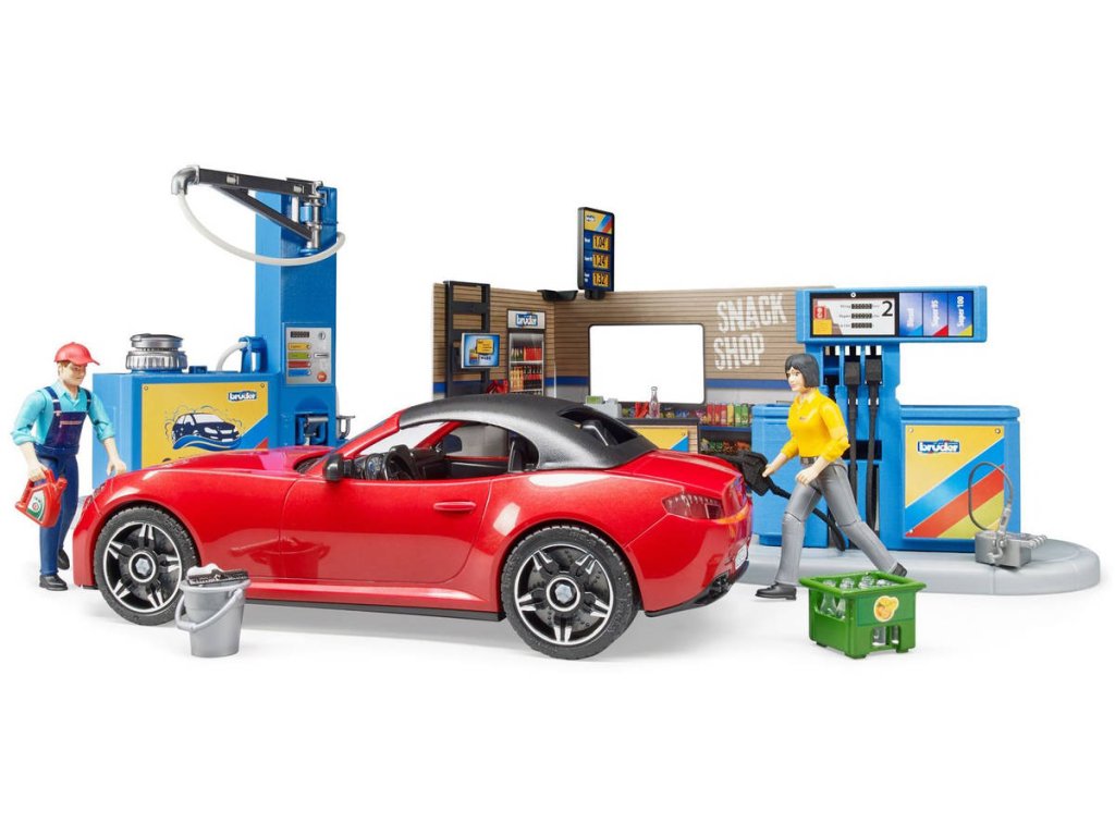 Všechna vozidla potřebují tankovat a občas i umýt. K tomu slouží nová, skvěle vybavená čerpací stanice Bworld. Na čerpací stanici jsou k dispozici všechny běžné druhy paliva včetně nabíjecí stanice pro e-vozidla. Sada obsahuje také sportovní vůz Bruder 3480. Auto má odnímatelnou střechu.