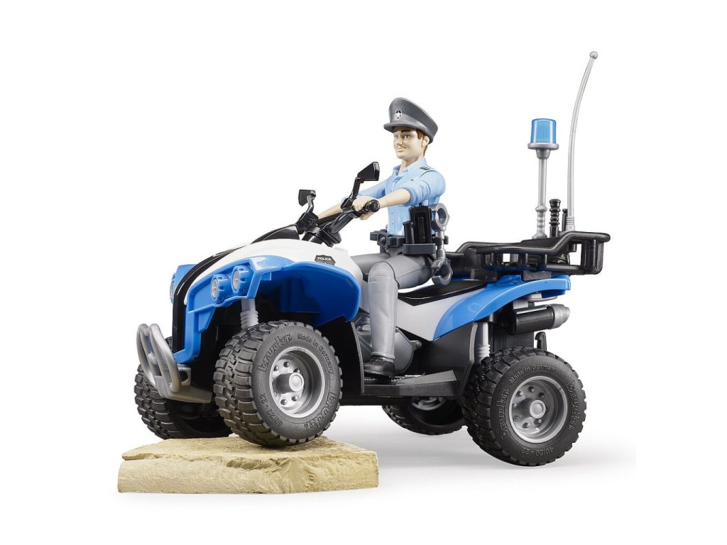 Terenní čtyřkolka s figurkou řidiče, policisty. Řízení modelu je možné pomocí řidítek. Možnost natáčení přední nápravy. Nápravy čtyřkolky jsou odpružené. Je také možné vložení další figurky BRUDER WORLD do sedadla. Čtyřkolka je mechanicky pohyblivá. Hrací plastová figurka má policejní uniformu a součástí jsou také pomůcky používané při práci - Policejní čepice, opasek, pouta, vysílačka, pistole, baterka a obušek. Pomůcky lze k figurce libovolně připevňovat a figurku lze použít i k autům a modelům BRUDER. Vyrobeno v Německu, z kvalitních materiálů. Hlavní vlastnosti: policejní čtyřkolka s natáčecí přední nápravoukompatibilní s figurkami BWORLDpolicista v uniformě s příslušenstvímvyrobeno v Německu