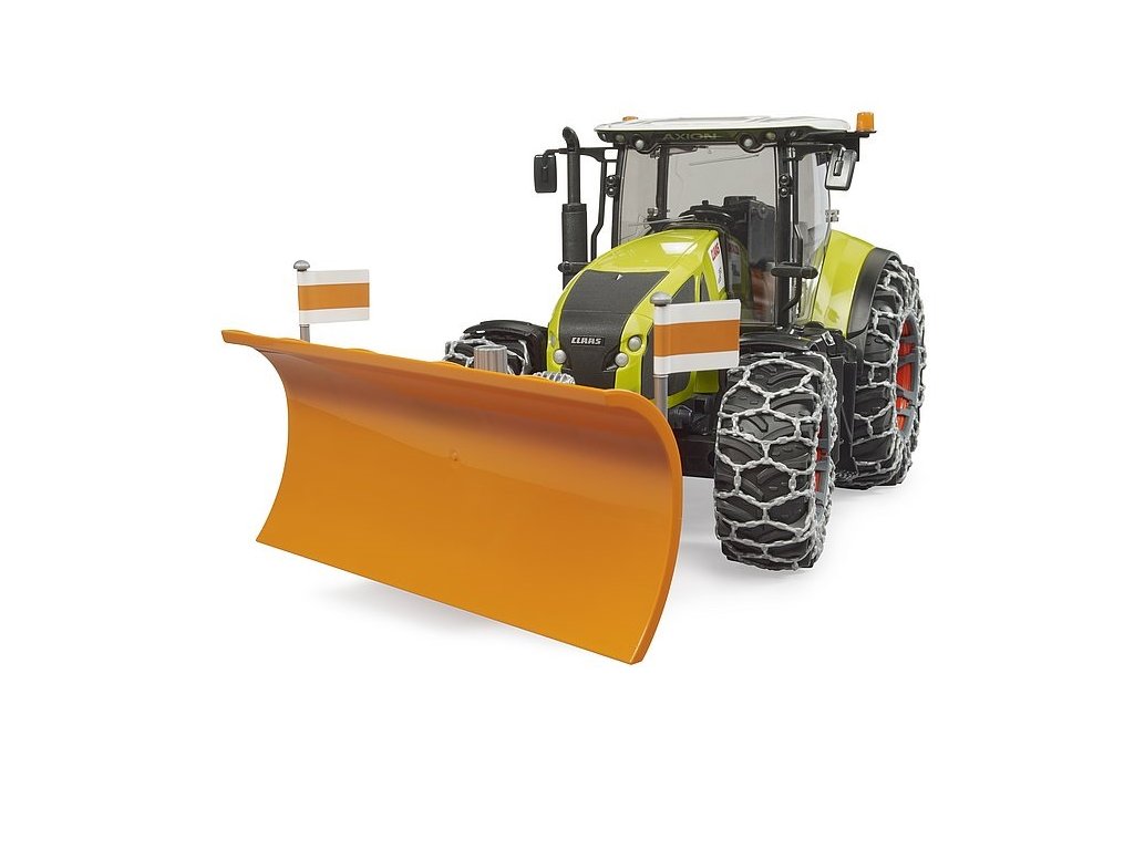 Bruder Claas Axion 950 se sněhovými řetězy a radlicí