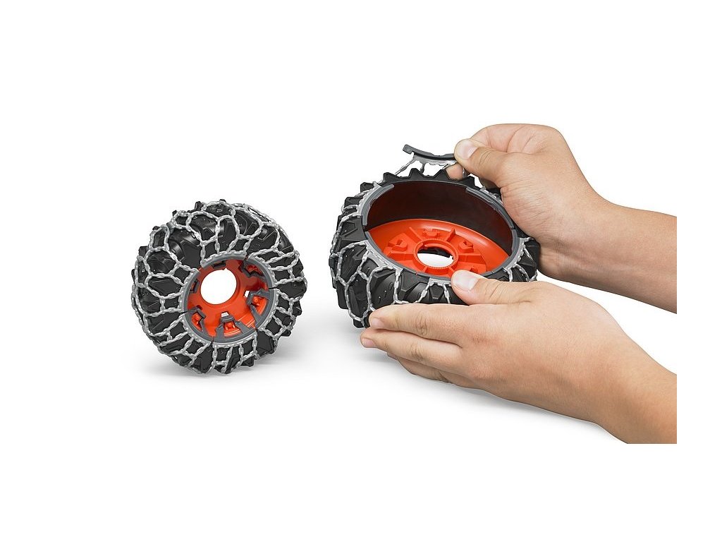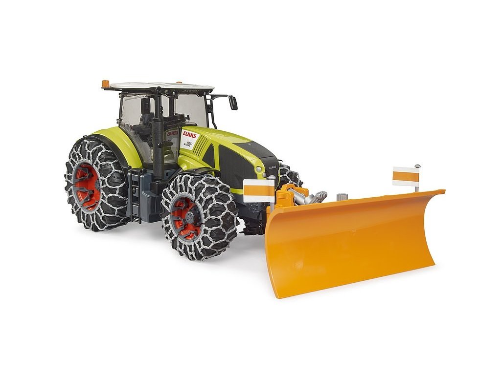 Bruder Claas Axion 950 se sněhovými řetězy a radlicí