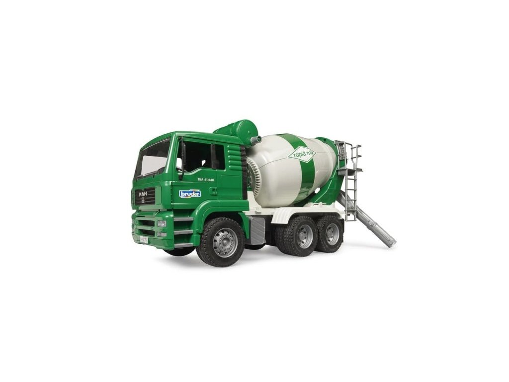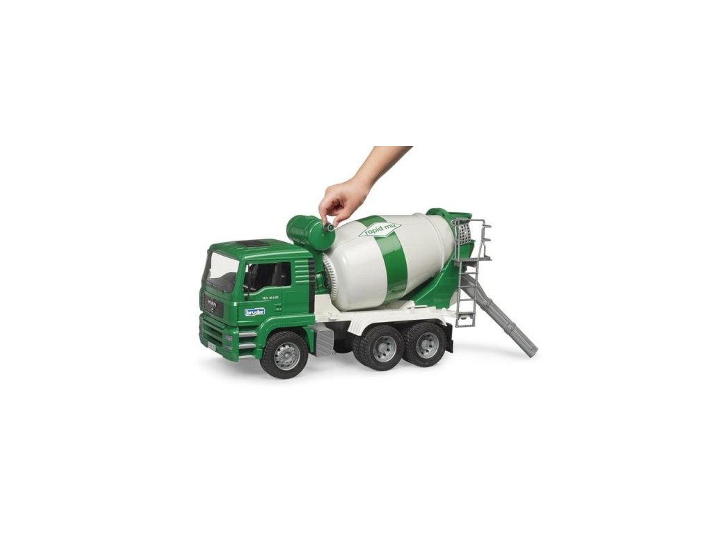 Tento domíchávač vychází jako novinka osvědčeného modelu MAN TGA. Jeho kabina se dá naklápět a umožňuje tak lepší výhled pro manipulaci. Díky otevíracím dveřím mohou do vozu nastupovat dělníci v podobě figurek Bruder. Buben míchačky je otočný a lze v něm míchat potřebný materiál. Změnou směru otáčení je možné z bubnu míchaný materiál vypustit. Šnekový dopravník na vnitřní straně bubnu dopravuje náklad do výsypného žlabu v zadní části. Hlavní vlastnosti: otevírací dveřerotační míchací buben Výsuvný skluz betonuotočný buben mixukvalitní a detailní zpracování kompatibilní s figurkami Bworldvyrobeno v Německu