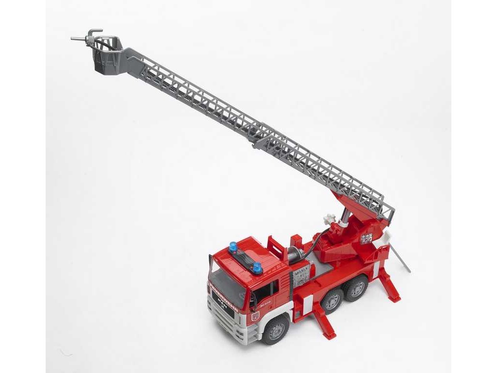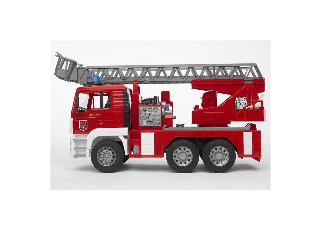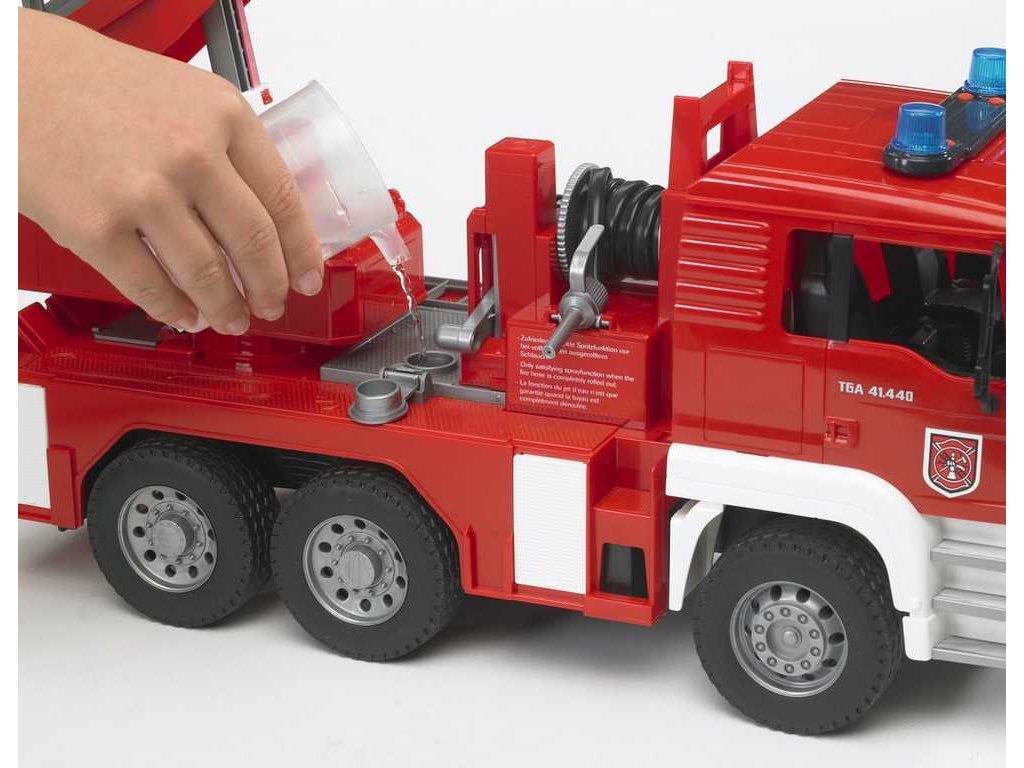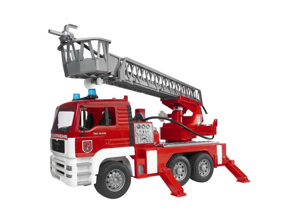 Bruder MAN TGA Hasiči se stříkačkou je propracovaný model vozidla s pevnými profilovanými pneumatikami, má plně sklopnou kabinu, je možno nahlédnout na blok motoru, je vybaveno plně funkční vodní pumpou a stříkačkou a především rozměrným výsuvným žebříkem. Rameno žebříku lze vysunout do délky až 80 cm! Plošina s výsuvným žebříkem je otočná, zrcátka u kabiny se dají sklopit a integrovanou nádrž na vodu lze jednoduše naplnit. Čtyři opěrné bloky zajišťují dokonalou stabilitu pro celé vozidlo i s vysunutým žebříkem. Zajímavostí na tomto vozidle je moderní multifunkční modul se světlem a zvukem. Vyrobeno v Německu, z kvalitních materiálů. Hlavní vlastnosti: plně sklopná kabinaplně funkční vodní pumpa a stříkačkarozměrný výsuvný žebřík do délky až 80 cmotočná plošina s výsuvným žebříkemsklopné zrcátkamoderní multifunkční modul se světlem a zvukemvyrobeno v Německu