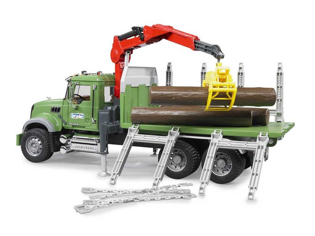 Bruder Nákladní auto MACK Granit přepravník dřevaNákladní auto MACK Granite je detailně propracovaný model skutečného náklaďáku. Čelní sklo je vyrobeno z průhledného nerozbitného polykarbonátu, dveře kabiny lze otevřít, boční zrcátka jsou sklopná, vyklápěcí kapota umožňuje pohled na blok motoru a nakládací rampa je také sklopná. Nákladní auto MACK Granite přeprava dřeva disponuje otočným jeřábem o 360°, který je nezbytný pro nakládání a vykládání dřeva. Lepší stabilitu celého vozu zajišťují opěrné nohy a součástí jsou také 3ks klád. Vyrobeno v Německu, z kvalitních materiálů. Hlavní vlastnosti: detailně propracovaný model skutečného náklaďákuotočný jeřáb o 360°obsahuje také 3 ks kládvyrobeno v Německu