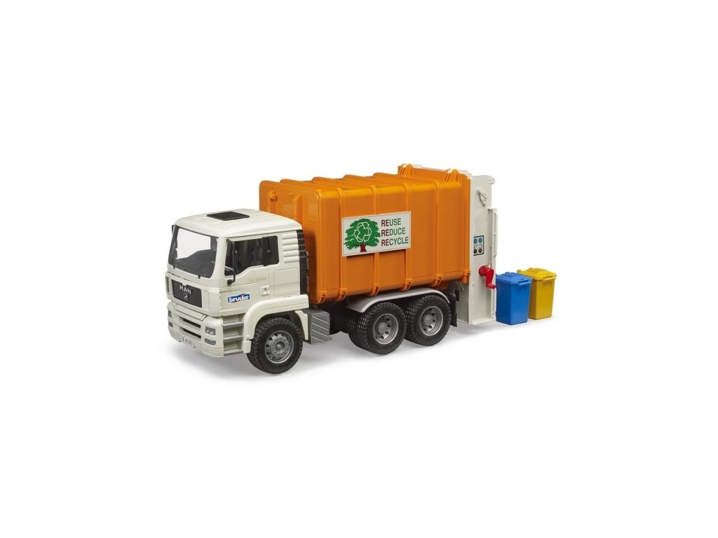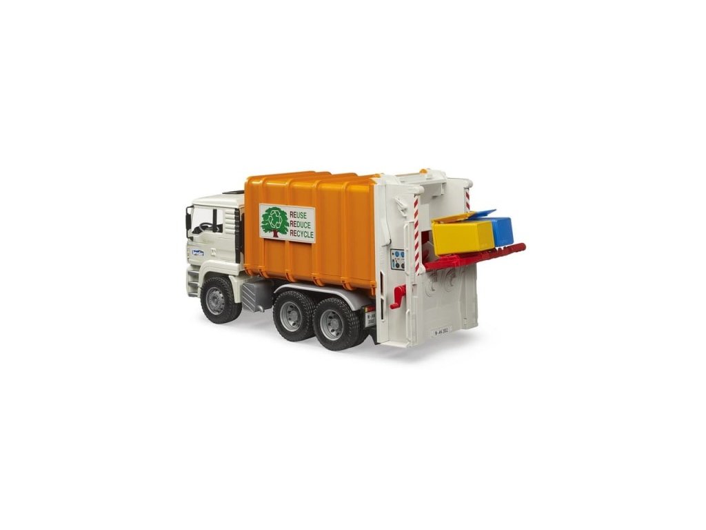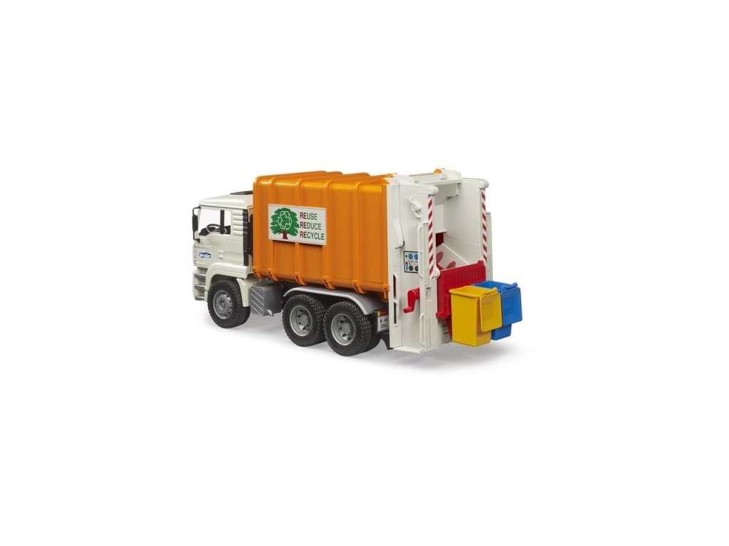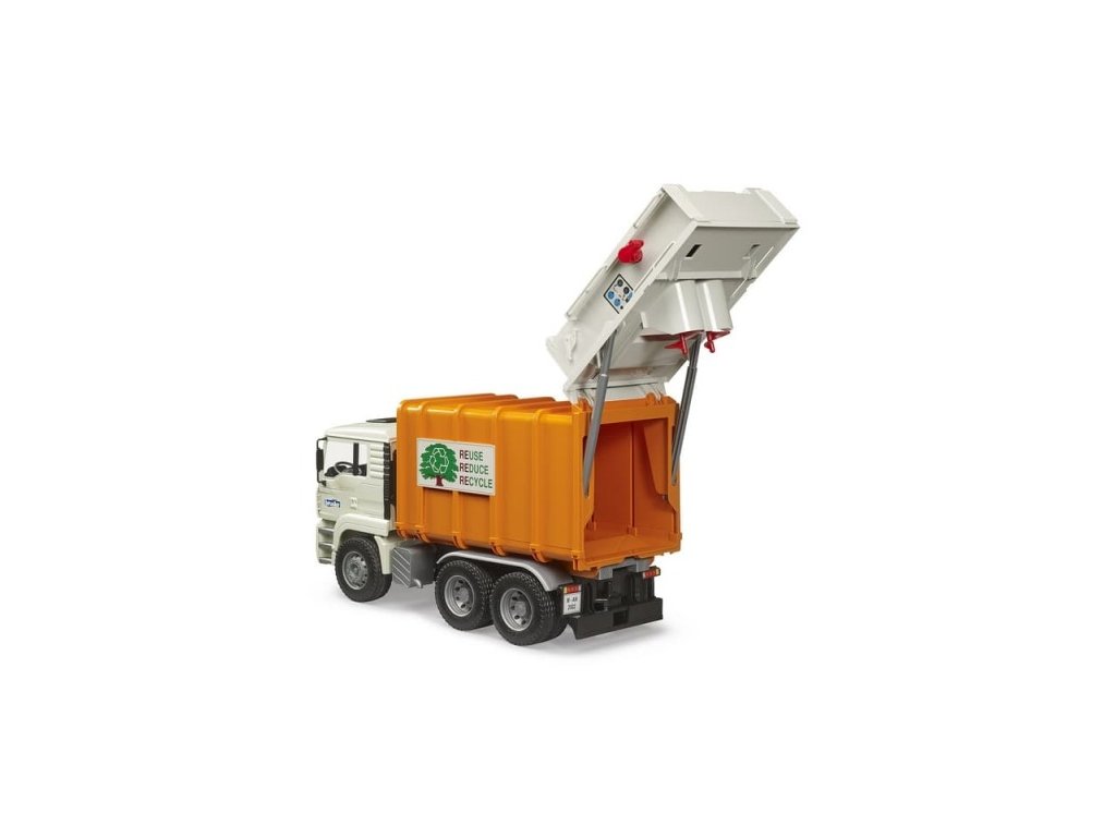 Kabina vozu se dá naklápět a umožňuje tak skvělý výhled. Tento popelářský vůz posouvá odpadky do lisovací komory pomocí dvou spirálových dopravníků. Vůz se vyprazdňuje pomocí otevíracích zadních dveří, které se v koncové poloze automaticky uzamknou. Součástí balení jsou dvě popelnice. Tento model vychází ze známého a osvědčeného modelu MAN TGA. Při výrobě tohoto modelu byl použit velice kvalitní ABS plast, což zaručuje jeho vysokou odolnost a dlouhou životnost. Hlavní vlastnosti: vyklápěcí korba šnekový dopravníkna odpadotevírací funkční prvky kompatibilní s figurkami Bworldvyrobeno v Německuvhodné od 3 let
