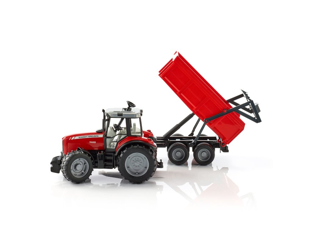 Bruder Traktor MASSEY FERGUSON se sklopným vozem červený Bruder traktor Massey Ferguson 7480 s valníkem BR2211 se pyšní moderním červenobílým designem značky Massey Ferguson. Jedná se o detailně propracovaný model s valníkem - sklápěčkou s mnoha funkcemi. Traktor má otevíratelný motorový prostor, dvířka, funkční řízení - součástí je druhý volant s delším ramenem, který se zasune do stávajícího volantu v kabině střešním výsuvným otvorem a tím velmi usnadní ovládání stroje. Otevíratelná kapota motoru umožňuje nahlédnout na blok motoru a traktoru nechybí ani odolné profilované pneumatiky, které jsou vhodné pro každý terén. Traktor lze též dovybavit čelním nakladačem (BR2005/2317). Součástí tohoto setu je plně funkční přívěs neboli valník, který se dá postavit samostatně - součástí je sklápěcí opěrná noha. Má pevné profilované pneumatiky a lze ho kombinovat se všemi traktory profi série Mercedes Benz. Vyrobeno v Německu, z kvalitních materiálů.Hlavní vlastnosti: mnoho funkcíotevíratelný motorový prostor i dvířkafunkční řízení - součástí je druhý volant s delším ramenemplně funkční přívěsvyrobeno v Německu