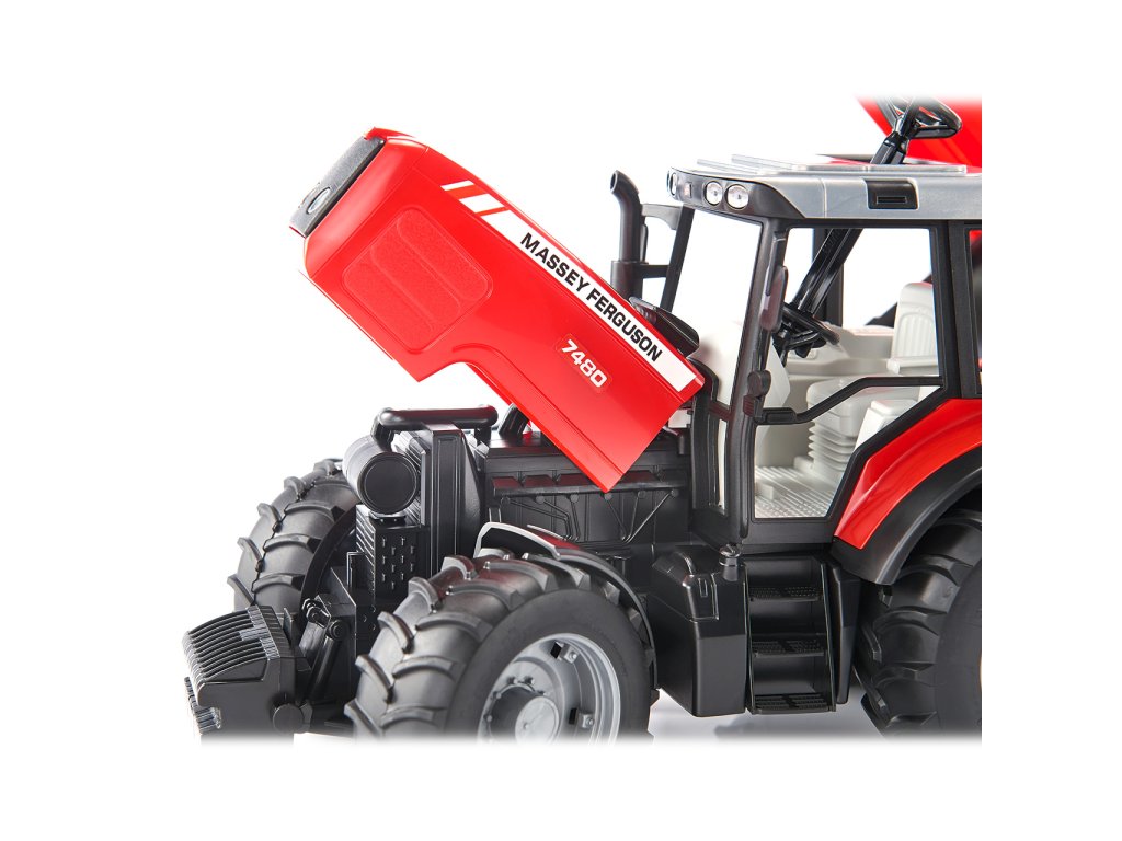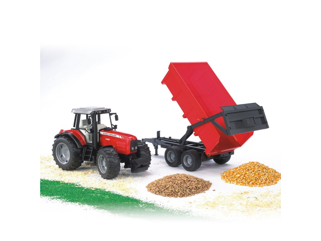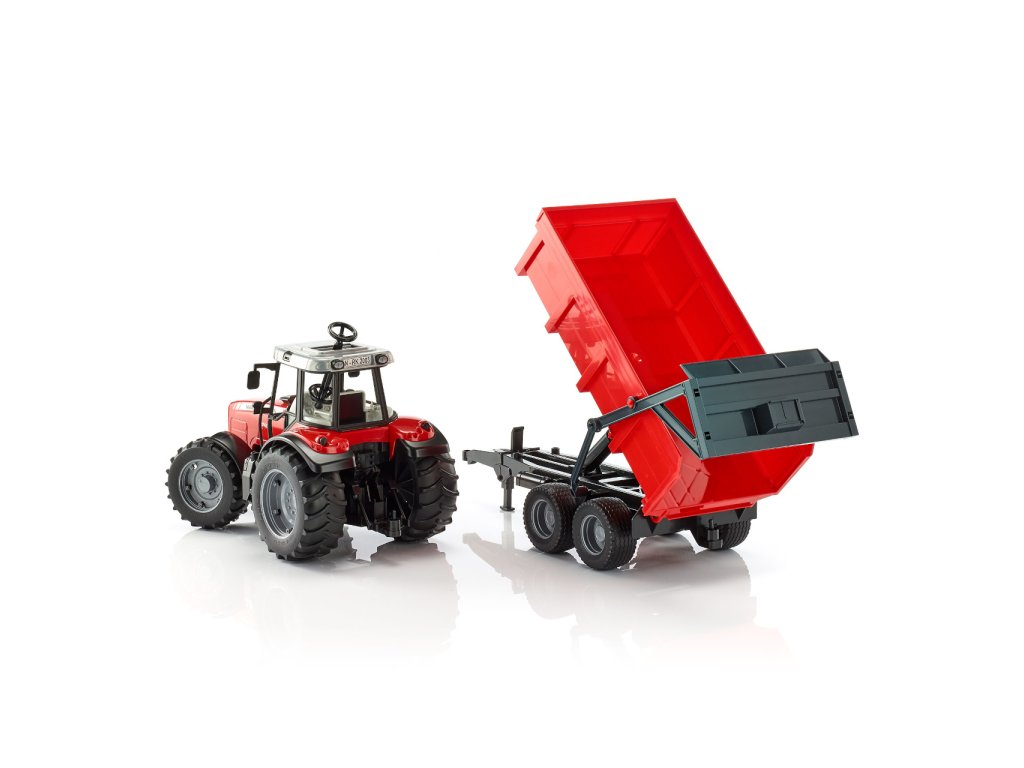 Bruder Traktor MASSEY FERGUSON se sklopným vozem červený Bruder traktor Massey Ferguson 7480 s valníkem BR2211 se pyšní moderním červenobílým designem značky Massey Ferguson. Jedná se o detailně propracovaný model s valníkem - sklápěčkou s mnoha funkcemi. Traktor má otevíratelný motorový prostor, dvířka, funkční řízení - součástí je druhý volant s delším ramenem, který se zasune do stávajícího volantu v kabině střešním výsuvným otvorem a tím velmi usnadní ovládání stroje. Otevíratelná kapota motoru umožňuje nahlédnout na blok motoru a traktoru nechybí ani odolné profilované pneumatiky, které jsou vhodné pro každý terén. Traktor lze též dovybavit čelním nakladačem (BR2005/2317). Součástí tohoto setu je plně funkční přívěs neboli valník, který se dá postavit samostatně - součástí je sklápěcí opěrná noha. Má pevné profilované pneumatiky a lze ho kombinovat se všemi traktory profi série Mercedes Benz. Vyrobeno v Německu, z kvalitních materiálů.Hlavní vlastnosti: mnoho funkcíotevíratelný motorový prostor i dvířkafunkční řízení - součástí je druhý volant s delším ramenemplně funkční přívěsvyrobeno v Německu