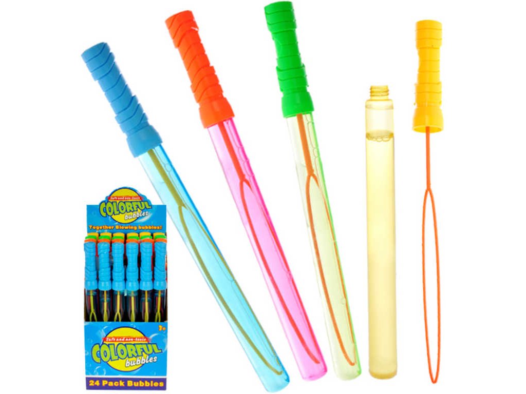 Bublifuková hůlka ve tvaru meče, ve čtyřech barevných variantách, na tvorbu extra velkých bublin.