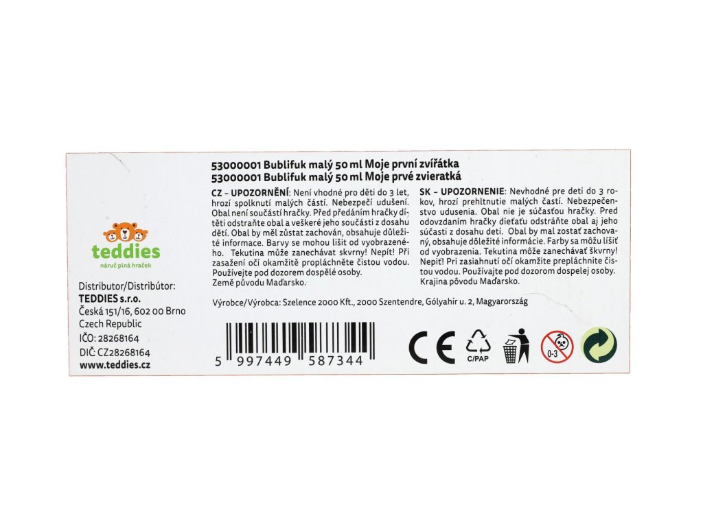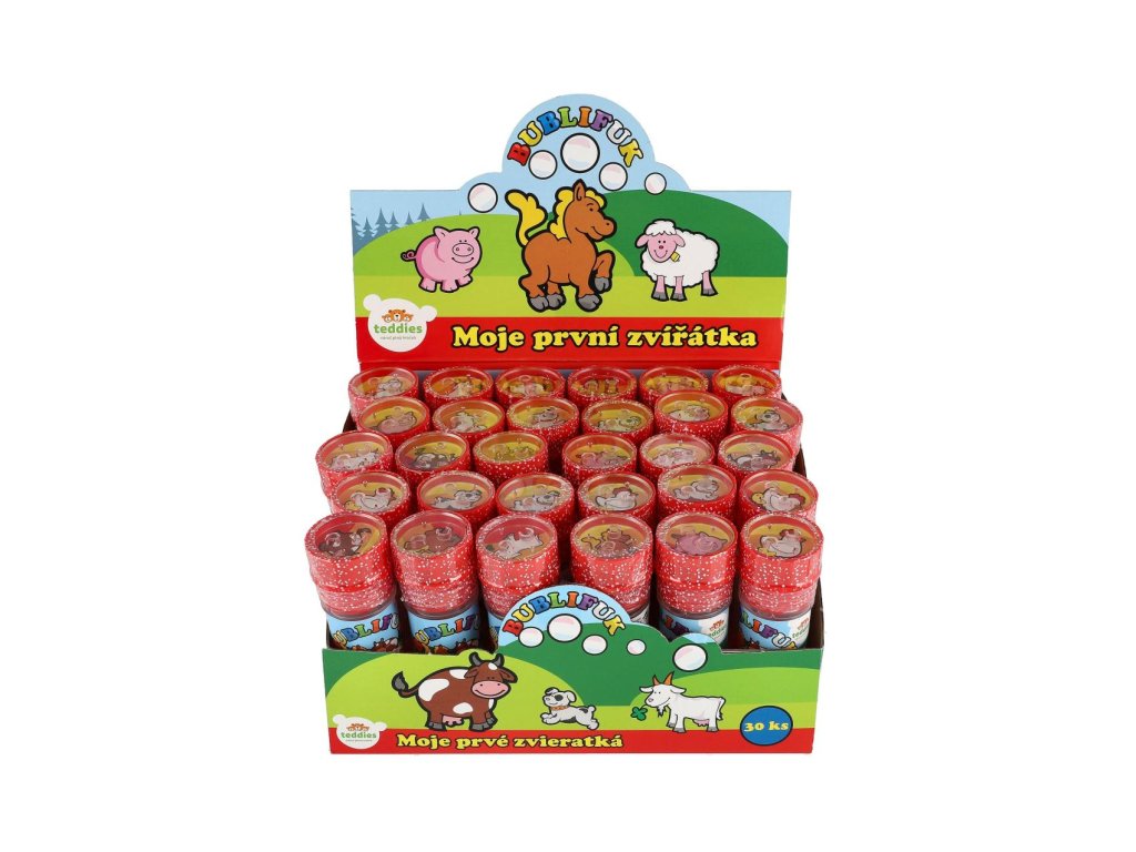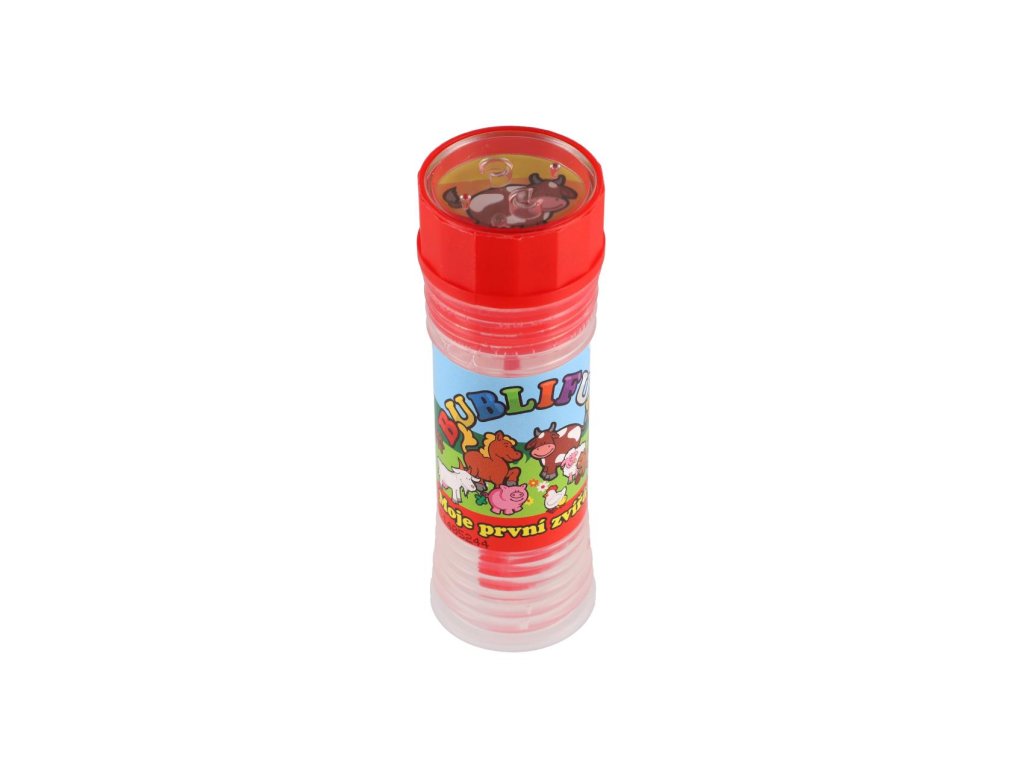 Senzační bublifuk s motivem Moje první zvířátka má obsah 50 ml. V barevném víčku se navíc nachází zábavná hra! Foukátko je součástí víčka.