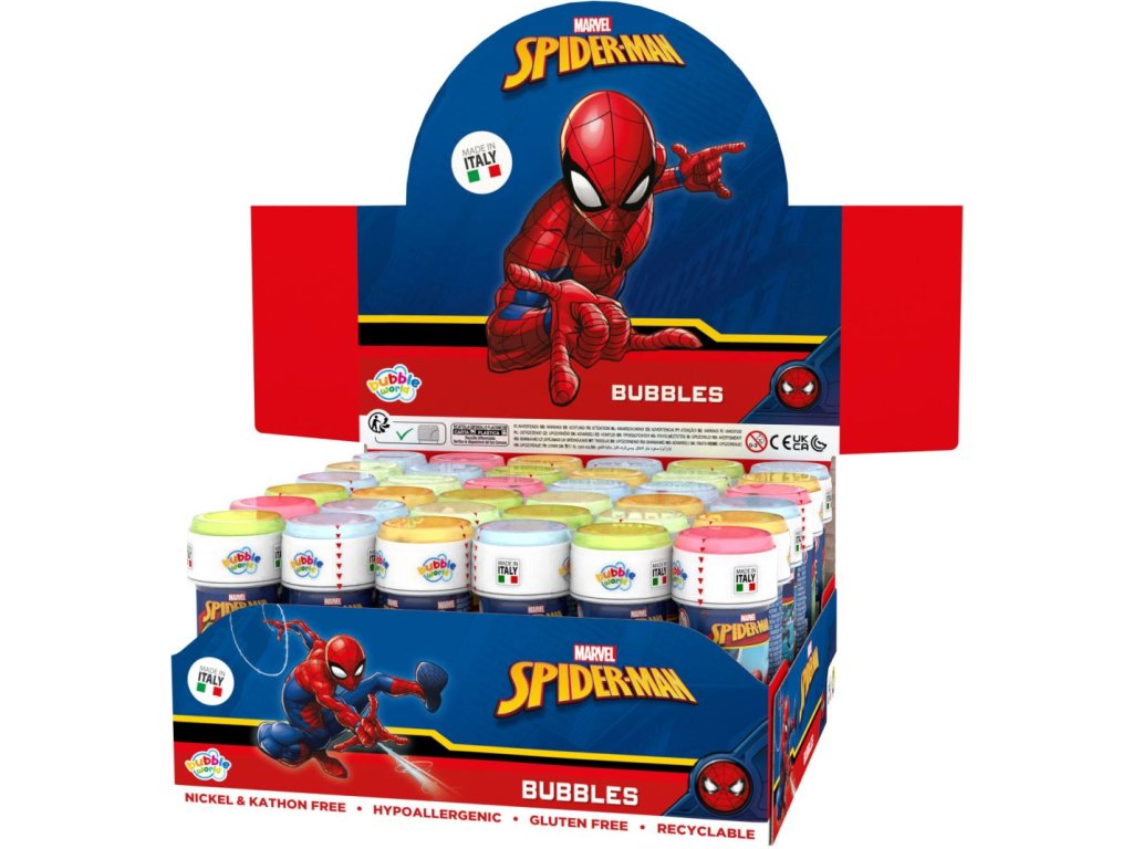 Bublifuk s motivem akčního hrdiny Spider-mana o obsahu 60 ml. Součástí barevného víčka je hra a foukátko. Lze zakoupit i jako celý display, kde je 36 ks.