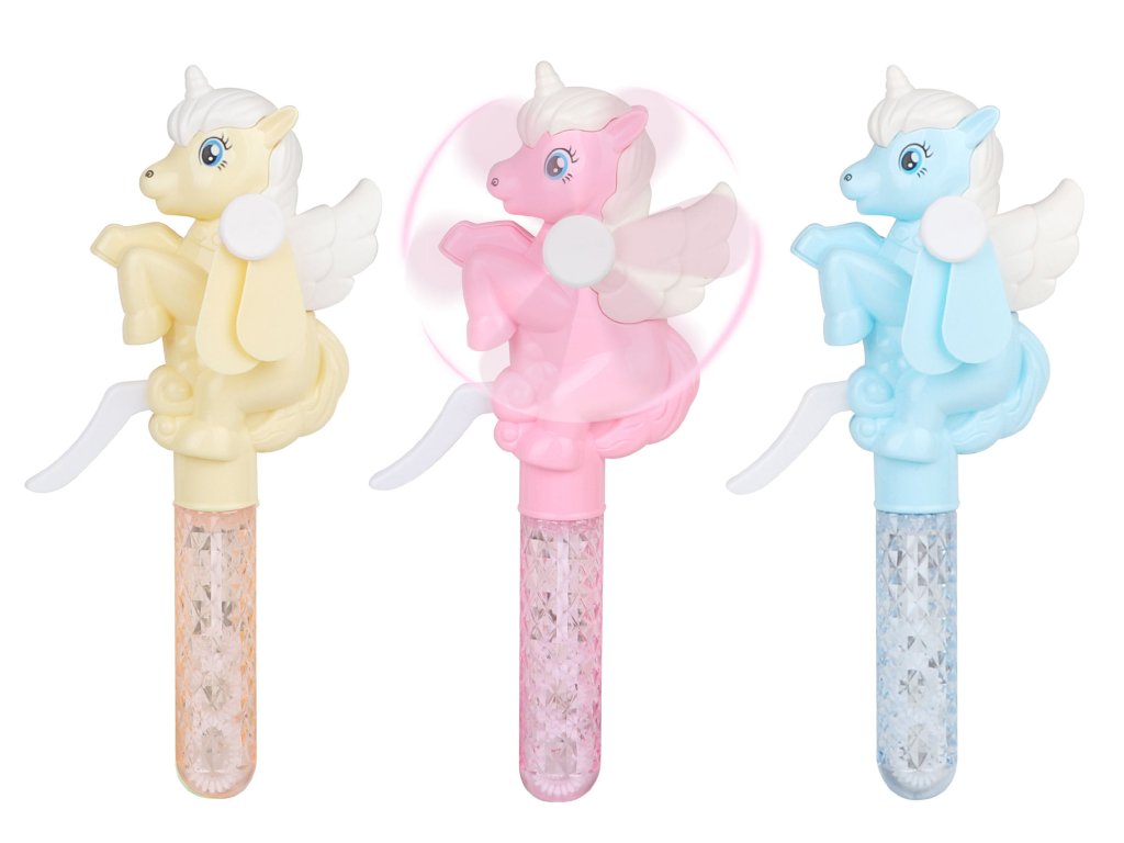 Bublifuk ventilátor jednorožec. Objem 30 ml. Rozměry 11x5x21,5 cm. 12 ks display box. 3 varianty - žlutý, růžový, modrý.