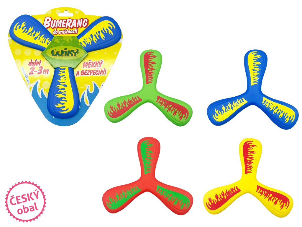 Bumerang do místnosti - český obal. Velikost 21 cm. Bumerang vhodný do interiéru. Dolet 2 až 3 metry. 4 barevné varianty - modrá, zelená, žlutá, červená.