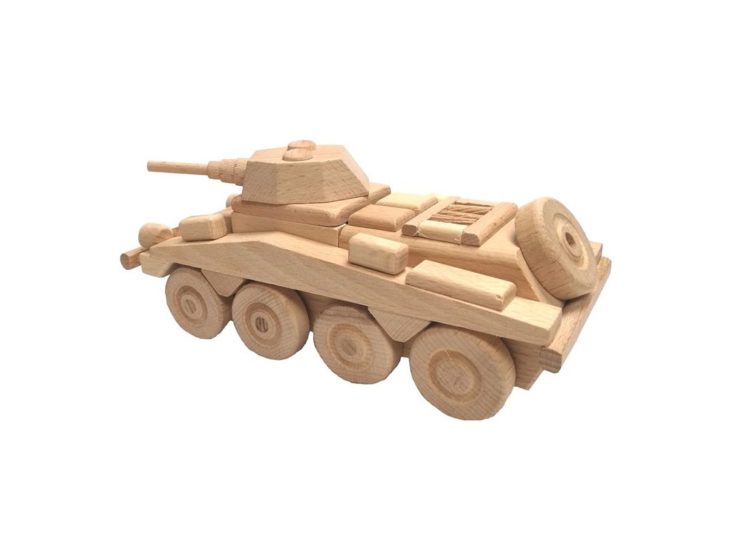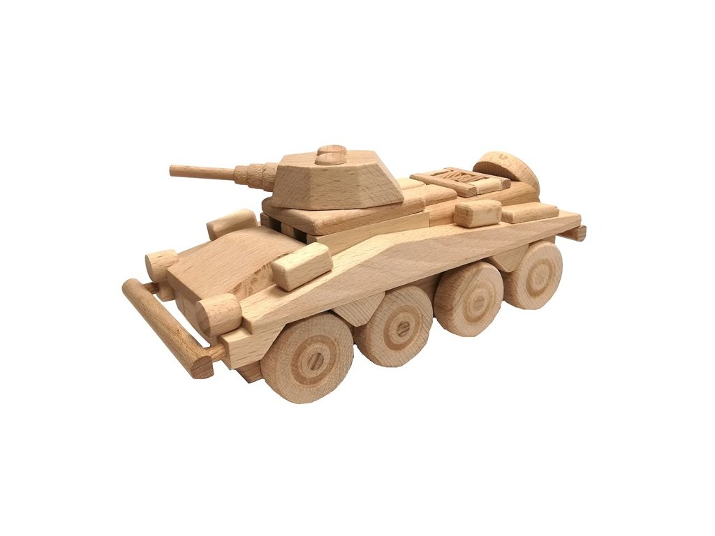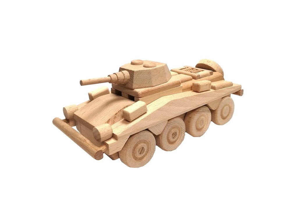 Dřevěný model transportéru je vyroben z vysoce kvalitního bukového dřeva. Jeho povrch je pouze voskován a leštěn, není nijak chemicky upravován či barven, aby byl zachován přírodní vzhled. Dřevěnému transportéru se točí kolečka a nemá žádné ostré hrany. Je vhodné i na pískoviště. Hlavní vlastnosti: Precizní zpracování bukového dřeva Zaoblené hrany Pohyblivé prvky modelu