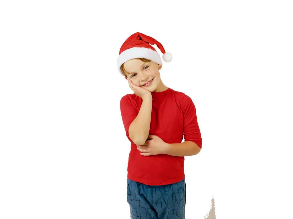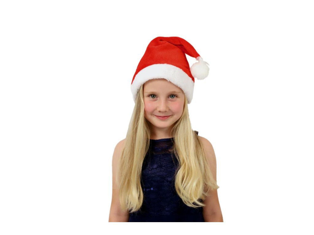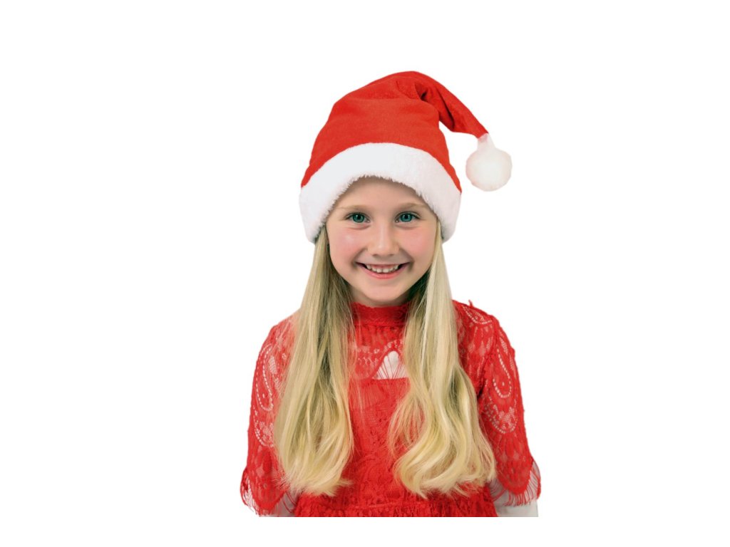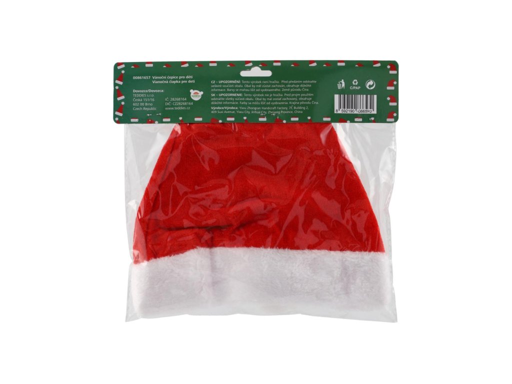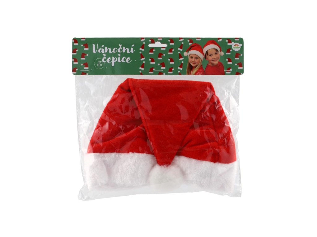 Dětská vánoční čepice má typický design ve stylu Santy s vesele červenou barvou a bílým lemováním a bambulkou. Čepice je ideální na vánoční oslavy, dětské představení a jako doplněk k vánočním kostýmům. Tyto čepice jsou považovány za symbol radosti a veselí během vánočních svátků.