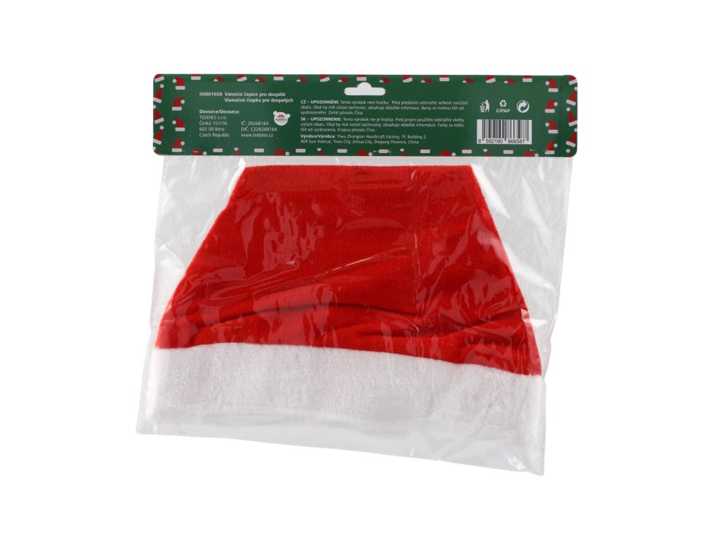 Vánoční čepice pro dospělé má typický design ve stylu Santy s vesele červenou barvou a bílým lemováním a bambulkou. Čepice je ideální na vánoční oslavy, věčírky a jako doplněk k vánočním kostýmům. Tyto čepice jsou považovány za symbol radosti a veselí během vánočních svátků.