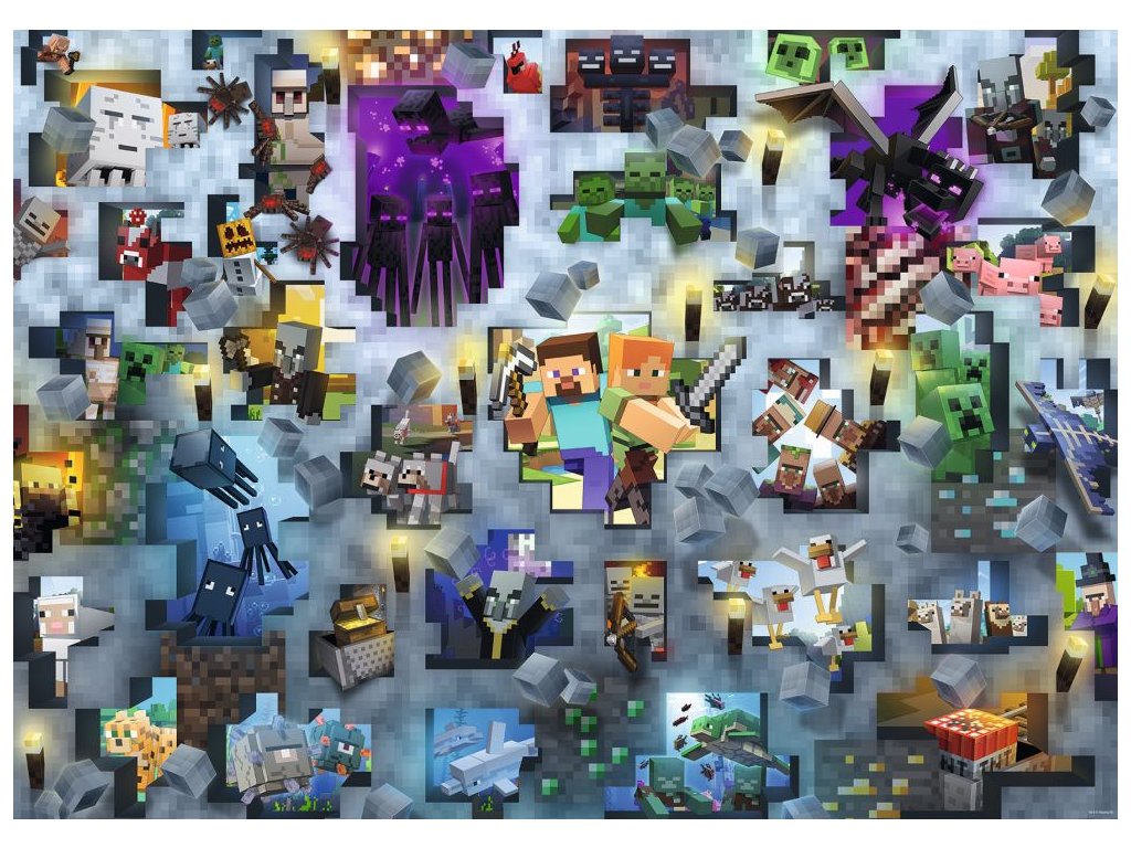 Challenge Puzzle - to je puzzle pro opravdové puzzle mistry. Spousta maličkých, barevně sladěných motivů na jedné ploše. Zažijte nesrovnatelnou zábavu při skládání vysoce kvalitního Challenge Puzzle s motivem Minecraftu od společnosti Ravensburger. Jedinečné dílky puzzle do sebe perfektně zapadají.