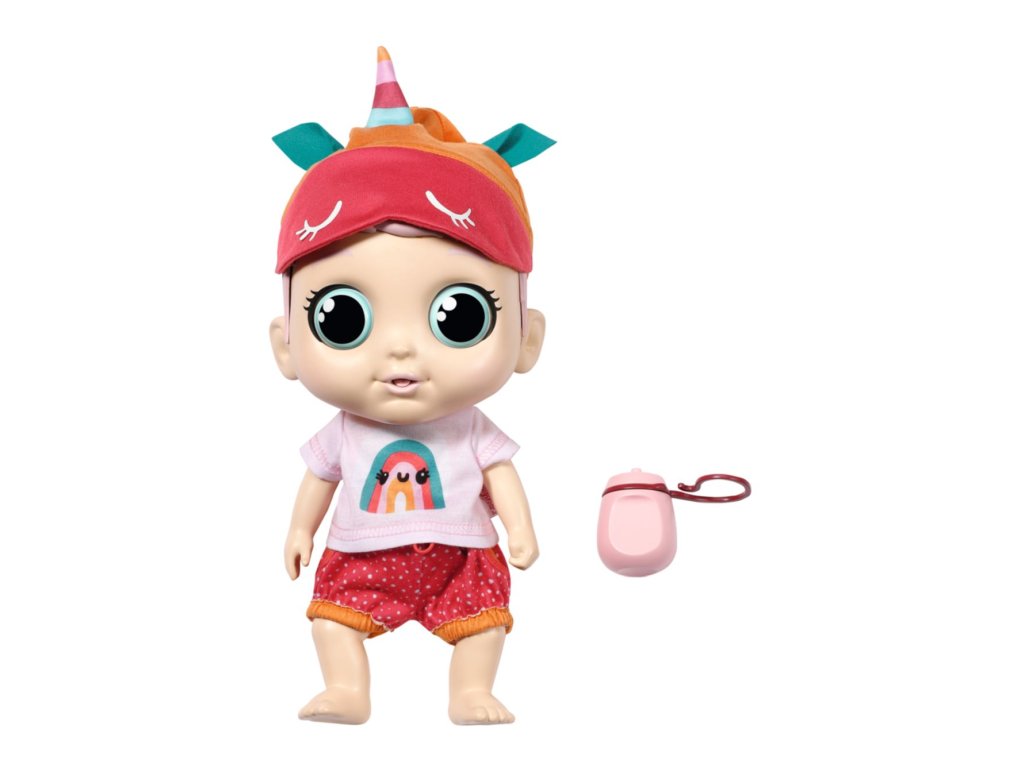 Po zábavné hře 30 cm velká panenka slyšitelně saje ze své lahvičky nebo cumlá dudlík. Po radostném hraní má nejen žízeň, ale je i unavená. Když ji malá maminka kolébá ke spánku, svou pohodu dává CHOU CHOU najevo zíváním a zvuky spinkání. Legrační jednorožčí čepička slouží jako maska na spaní.