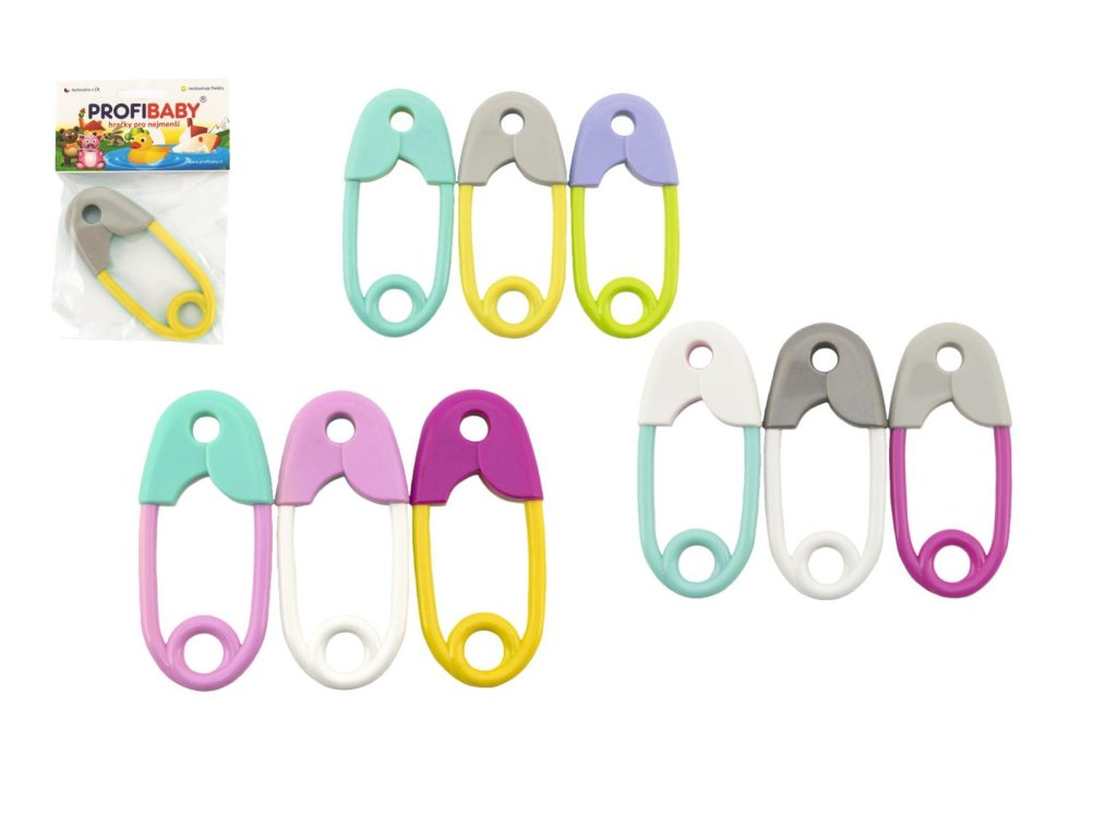 Chrastítko špendlík plast 12cm mix barev v sáčku 0m+