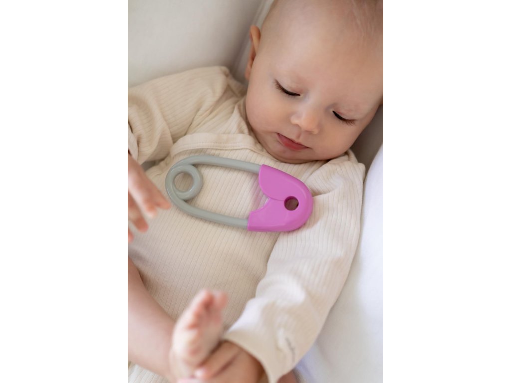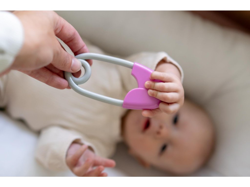 Chrastítko špendlík plast 12cm růžovošedé 12x19cm v sáčku 0m+