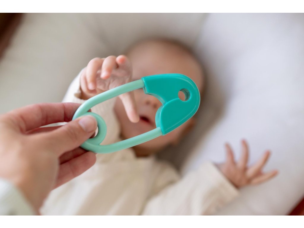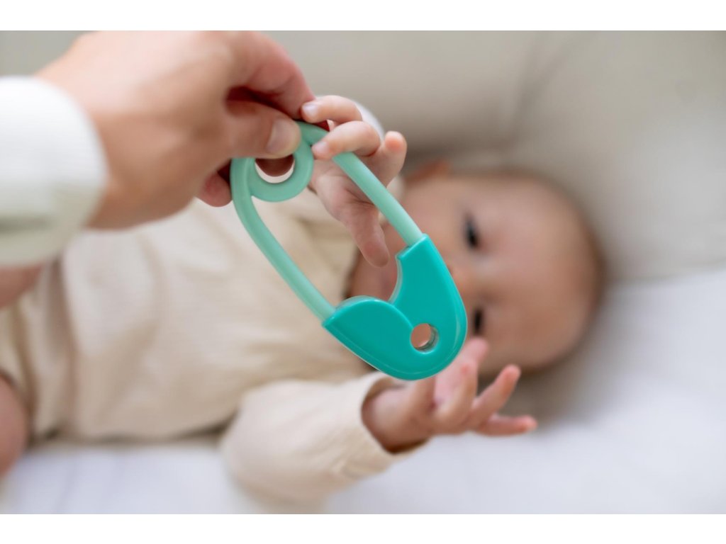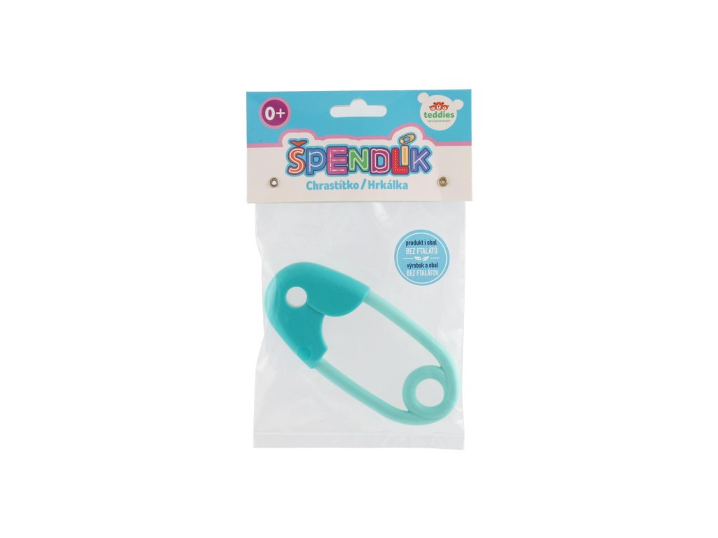 Chrastítko špendlík plast 12cm tyrkysové 12x19cm v sáčku 0m+