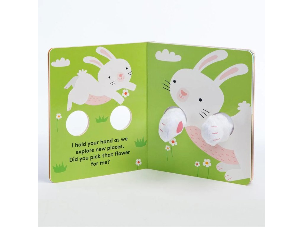 Maminka malého zajíčka drží za ruku, když s ním prozkoumává nová místa. Její paže mu ukážou, jak najít ty nejlepší dobroty. Tato objímatelná prstová loutková kniha má jemný příběh o rodičovské lásce a péči, od hraní her až po sdílení dobrot. Maňáskové knížky plné krásných ilustrací poskytují dětem i rodičům zábavný, interaktivní způsob, jak si společně hrát a číst. Podporují hmatové, sluchové a zrakové vjemy. Díky skladné velikosti děti zabaví i na cestách. Měkké prstové plyšové ramínka jsou trvale připevněna k zadnímu přebalu knihy. Knížka je vhodnou pomůckou pro procvičování angličtiny. Vyrobeno z papíru FSC a potištěno rostlinnými inkousty. Hlavní vlastnosti: pevná vazba z tvrdého kartonuinteraktivní, originální zpracovánípodporuje dětskou představivost a komunikaci příběh na dvanácti stránkách vhodné i na cestyvhodné od 0 do 3 let