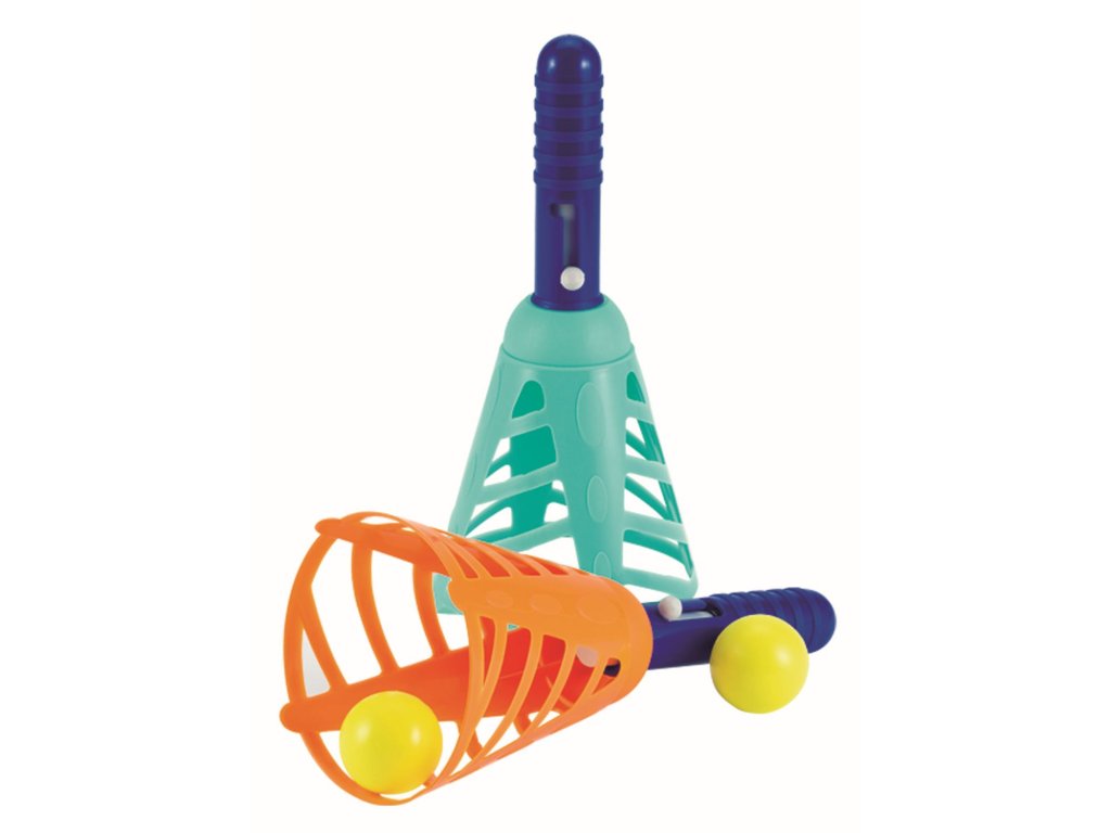 Tato hra je ideální pro trénink koordinace mezi rukou a očima. Cílem hry je vystřelovat míček a chytat ho do košíku. Pro 1-2 hráče. Sada obsahuje 2 koše do ruky a 2 míčky.