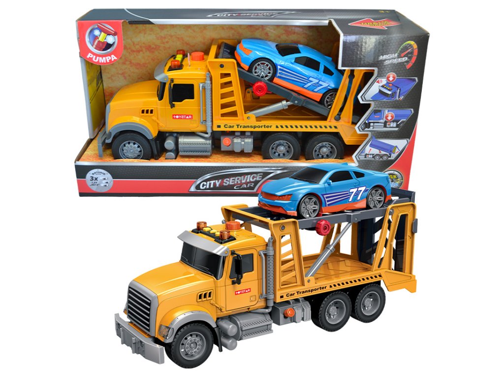 Oživte svět hraček s CITY SERVICE CAR - 1:12 Nákladním autem na přepravu osobních aut! Toto kompaktní hračkářské mistrovské dílo je dokonale vybaveno pro děti, které milují auta a dobrodružství. Je vyrobeno z odolného plastu, který je připraven na nekonečné hodiny zábavy a hry. Poslouchejte výbuchy zvuků a sledujte oslnivé světelné efekty, které přicházejí přímo z tohoto nákladního auta. S tlačítky pro zvukové a světelné efekty má vaše dítě plnou kontrolu nad všemi aspekty hry. Jedním z hlavních rysů tohoto nákladního auta je zvedací rampa, která pracuje pomocí pumpy umístěné na střeše kabiny. Vaše dítě může snadno manipulovat s touto pumpou a sledovat, jak se rampa zdvihne až k nebi. Toto nákladní auto také obsahuje jedno závodní auto, které vaše dítě může přepravovat po celém městě. Navíc, díky setrvačníku stačí auto jednou natahnout a hra může začít. Napájení auta je zajištěno 3x knoflíkovými bateriemi LR44, které zaručují dlouhodobý provoz bez nutnosti časté výměny. 1. Kombinace zvukových a světelných efektů pro zvýšení interakce a zábavy. 2. Zvedací rampa s pumpou pro realistické hraní a zvyšování motorických dovedností. 3. Součástí balení je závodní auto pro rozšíření hry a fantazie. 4. Odolný plastový materiál garantuje dlouhou životnost a odolnost vůči hrubé manipulaci. 5. Setrvačník pro snadnou manipulaci a hru bez nutnosti baterií.