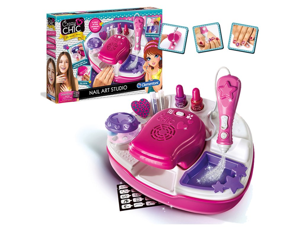 Moderní konzole pro začínající odborníky na nehty s aplikátorem laku na nehty s třpytkou a sušičkou. Souprava obsahuje nejnovější kolekci laků na nehty CRAZY CHIC, praktické zdobící pera, mnoho šablon a lesk. - Věk 7+
