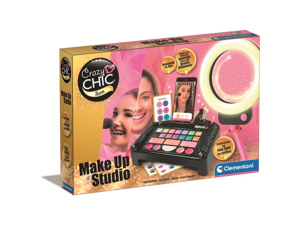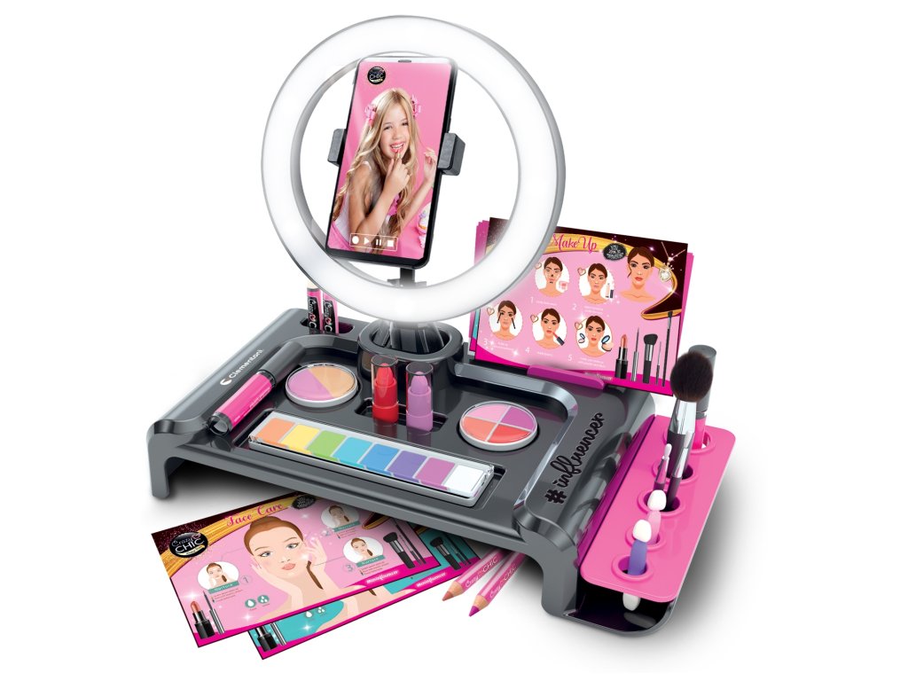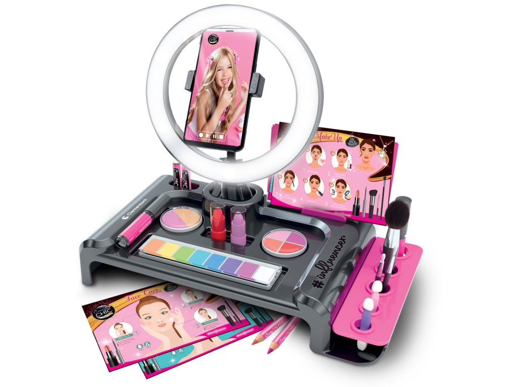 Bohatá a moderní make-up sada navržená tak, aby inspirovala dívky hrou inspirovanou současnými trendy. Součástí balení je bohatá paletka očních stínů, lesků a profesionálních štětců, integrované LED selfie kruhové světlo a plastový držák na smartphone, kterým můžete stát skutečným influencerem v líčení! Vyhrazená instruktážní aplikace s různými tipy, jak stát influencerem zabývajícím krásou, který vám umožní upravovat a personalizovat videa, abyste vyjádřili veškerou svou osobnost a kreativitu. Aplikace Crazy Chic zobrazuje různé fáze přípravy make-upu, jako je hydratace pleti, výběr barev podle barevných pravidel a vizualizace prostřednictvím náhledu vybraných palet na obličeji Tato sada Crazy Chic poskytuje integrovaný přístup k make-upu pomocí bezpečné a vysoce kvalitní kosmetiky, stejně jako inovativní a multifunkční koncept pro skvělou zábavu kombinující péči o krásu, provádění prvních make upů s prezentací efektů v moderním studiu začínajícího influencera! Obsah sady: Plastová kosmetická taštička pro uložení kosmetiky Kartáče Aplikátory Držák na karty a mobilní telefon Paletka se 14 očními stíny 2 druhy růžové 1 prášek 4 lesky na rty 1 houba 1 štětec a 3 aplikátory LED selfie prstencové světlo se skládacím stativem Protiskluzové podložky Skládací držák na mobilní telefon Make-up karty s tipy a techniky Samolepky Návod LED světlo vyžaduje 3 baterie AAA, které nejsou součástí balení Rozměry balení: šířka 45,1cm x výška 31,1cm x hloubka 7 cm