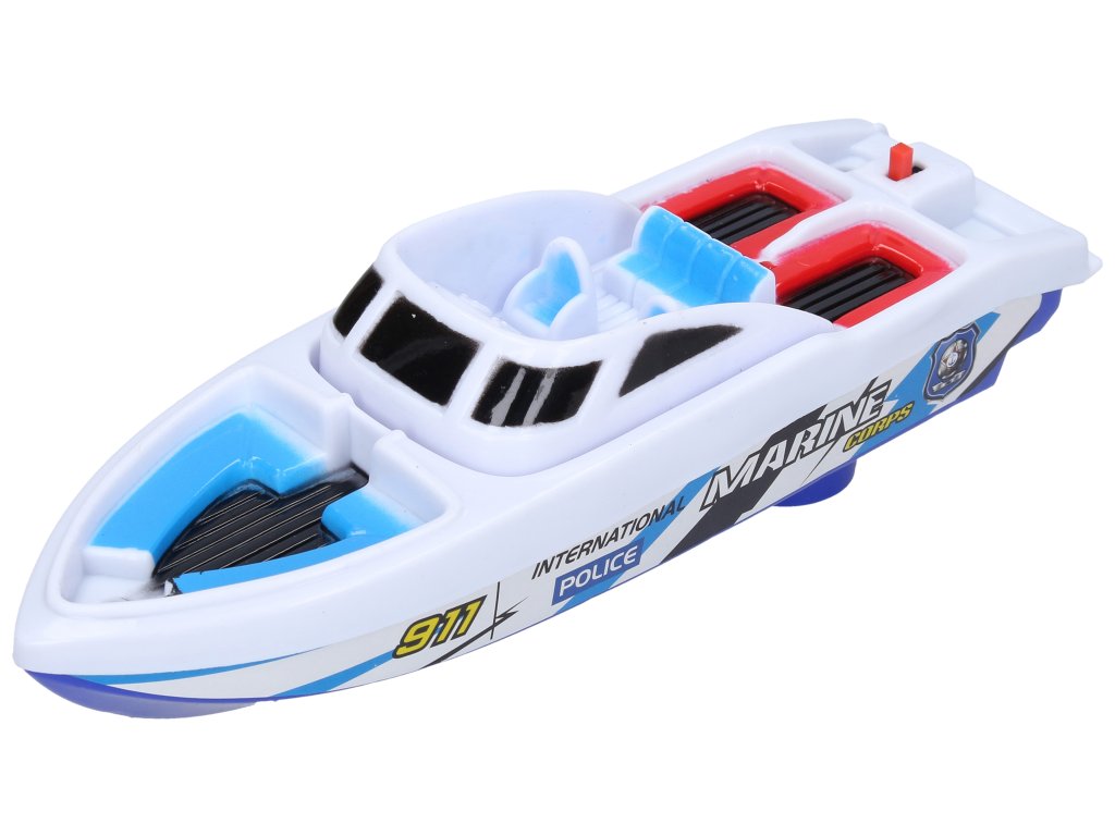 Člun. Rozměry 22,5x6,5x7 cm. Pohon na baterie. 2xAA baterie nejsou součástí. 2 barevné varianty: modrá, bílá.