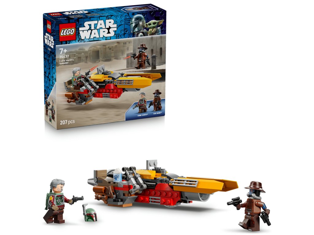 Spojte se s Cobbem Vanthem a pusťte se do akčních soubojů proti Cadovi Banemu s touto strhující stavebnicí LEGO® Star Wars™ (75437) pro děti. Postavte si propracovaný model úžasného spídru Cobba Vantha ze seriálu Star Wars: Mandalorian z kostek LEGO. Nechybí sedadlo řidiče pro minifigurku LEGO Cobba Vantha, klip na pistoli a skrytou přihrádku na uložení doplňků, včetně helmy Boba Fetta a kartonu mléka banthů. Součástí balení je minifigurka LEGO Cada Banea vybavená 2 blasterovými pistolemi a Cobb má také tryskový batoh pro akční hru ve vzduchu. Tato stavebnice poslouží jako parádní dárek pro kluky, holky a fanoušky seriálu Star Wars: Mandalorian nebo Star Wars: Boba Fett™ od 7 let a při hraní zažehne dětskou představivost. Děti si vychutnají intuitivní stavění s aplikací LEGO Builder, která jim umožní přibližovat a otáčet model ve 3D, ukládat a sledovat pokrok. Stavebnice obsahuje 207 dílků.