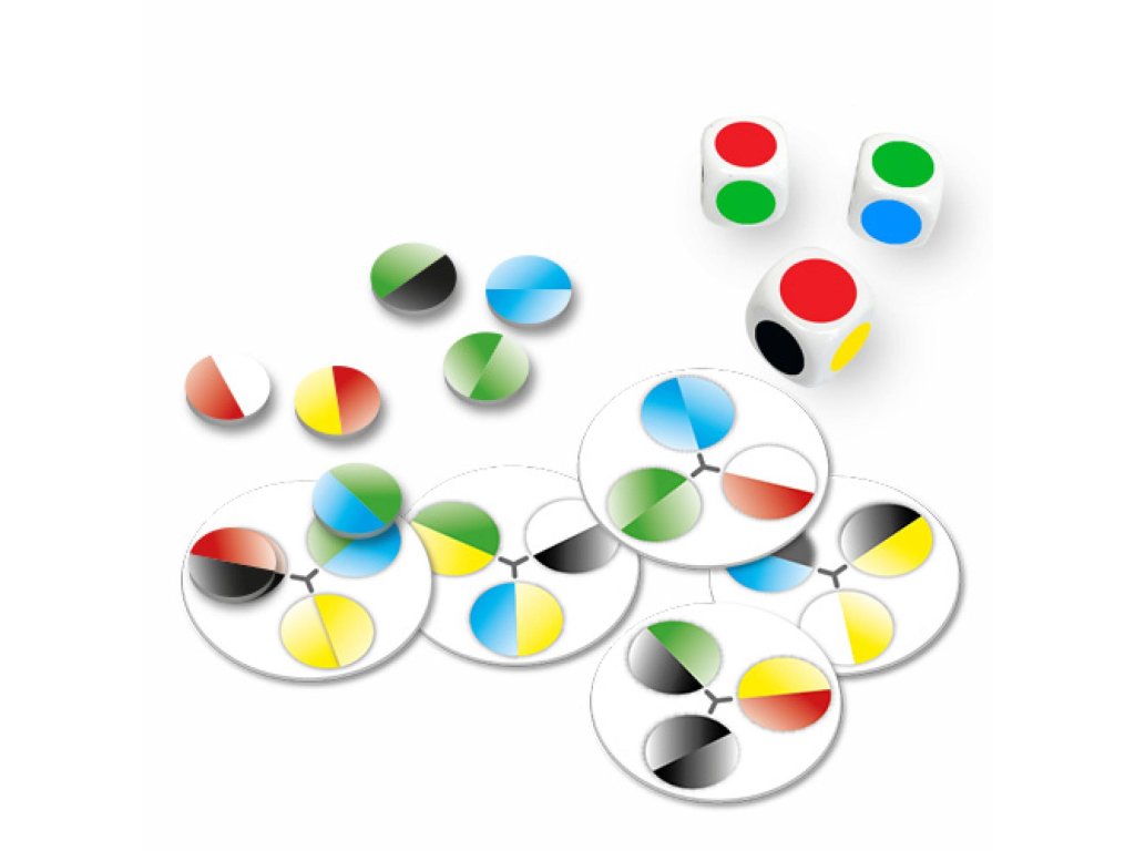 První na řadě hází všemi kostkami najednou a dle nastalé kombinace hledají všichni hráči správný žeton. Hráč, který najde žeton jako první jej umístí na jednu ze 7 karet hracího plánu. Žeton musí umístit na stejně barevné kolečko. Pokládá ho rubem nahoru, aby byla viditelná strana se 4 barvami, a nasměruje svou barvu ke středu karty (tam kde je čárka). Tím určuje, že je žeton jeho a získává body dle tabulky. Počet hráčů 2-5.