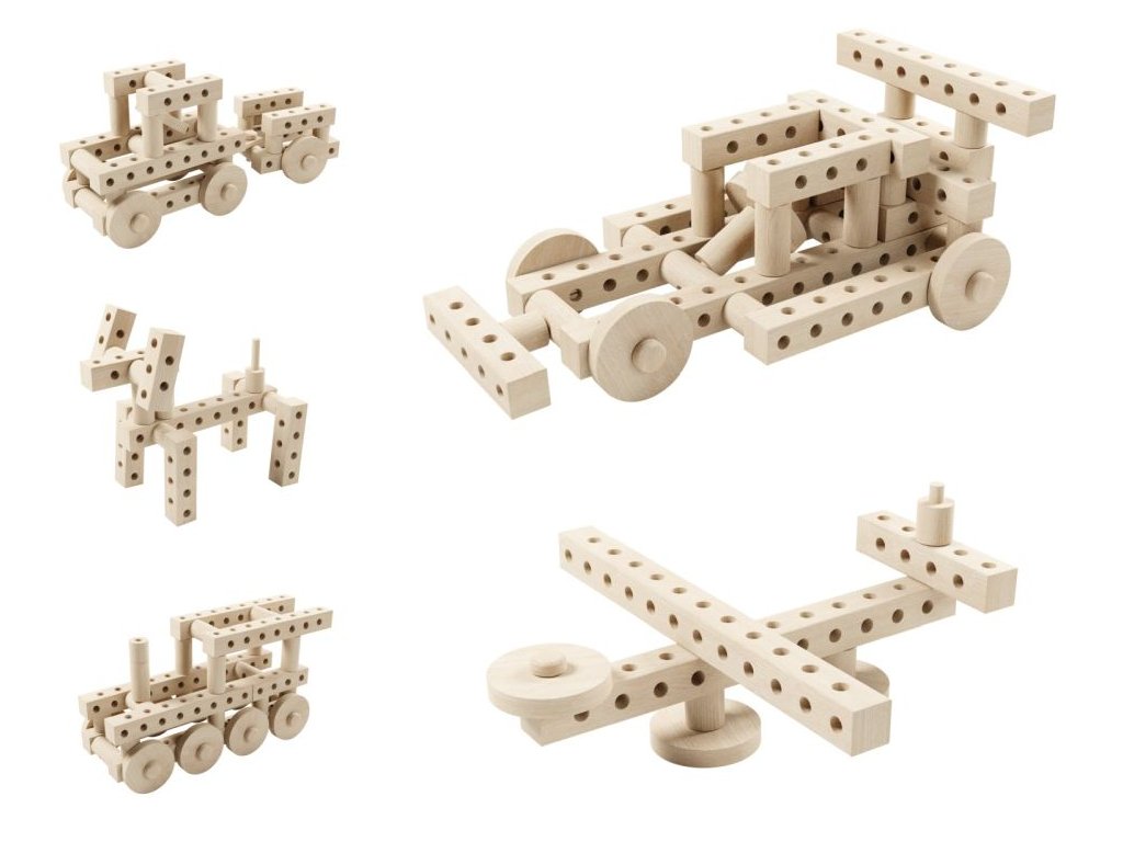 Složte si ze 67 dílků auta nebo zvířátka podle vašich představ. Nebo využijte některý z návodů na krabici a zabavte sebe i své děti na dlouhé hodiny dřevěnou kreativní zábavou.