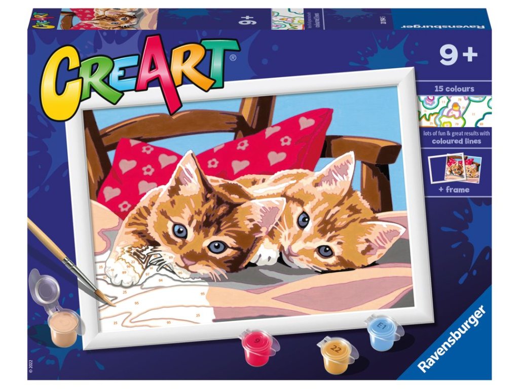 CreArt - to je kreativní zábava doslova pro každého. Staňte se na chvíli profesionálním malířem a namalujte si svůj vlastní obraz. Tato mazlivá koťata rozzáří každou zeď. Postupně vybarvujte jednotlivé plochy podle návodu (každé číslo na plátně odpovídá jedné konkrétní barvě) a dopřejte si radost z tvůrčí práce, u které se zabavíte na dlouhé hodiny. Malování je skvělá činnost, která nejen baví, ale také procvičuje zručnost, zlepšuje koncentraci a zaručuje spokojenost a pocit hrdosti všem umělcům. Set obsahuje vše, co potřebujete k malování: vysoce kvalitní, pevné plátno s obrazovou předlohou s očíslovanými plochami, sadu akrylových barev, štětec, kartonový stojánek pro kelímky s barvami a rámeček. Vykreslené plochy vytváří profesionálně vypadající umělecké dílo. Jakmile obraz dokončíte, nechte ho zaschnout a zarámujte ho do rámečku, který je součástí balení. Malování nikdy nebylo tak jednoduché.