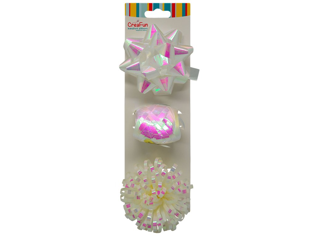 Dárková sada bílá duhově lesklá, 3 ks (stuha 10 m + 2 mašle)