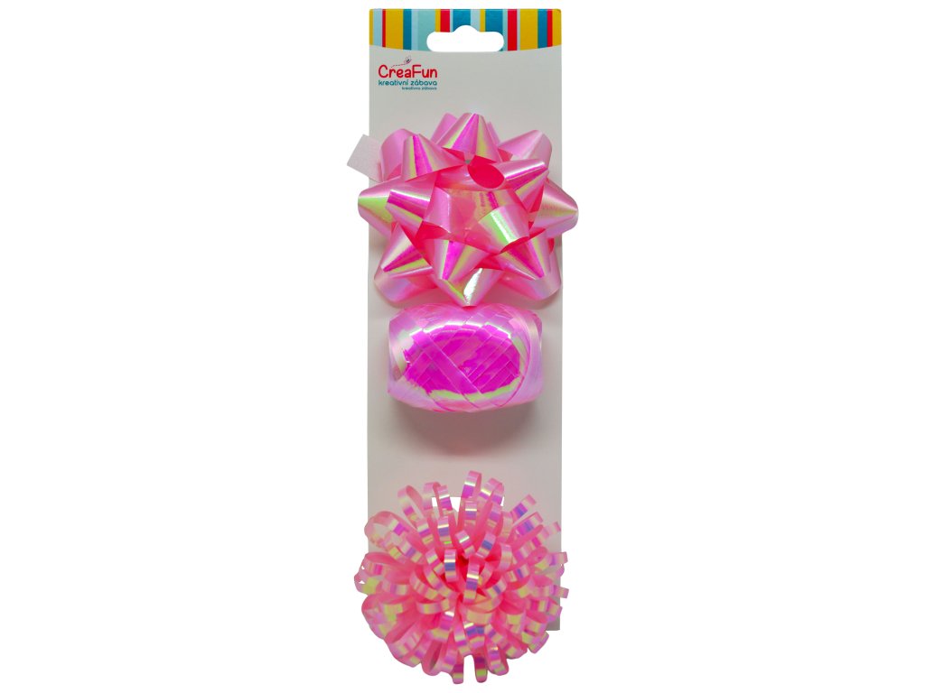 Dárková sada růžová duhově lesklá, 3 ks (stuha 10 m + 2 mašle)