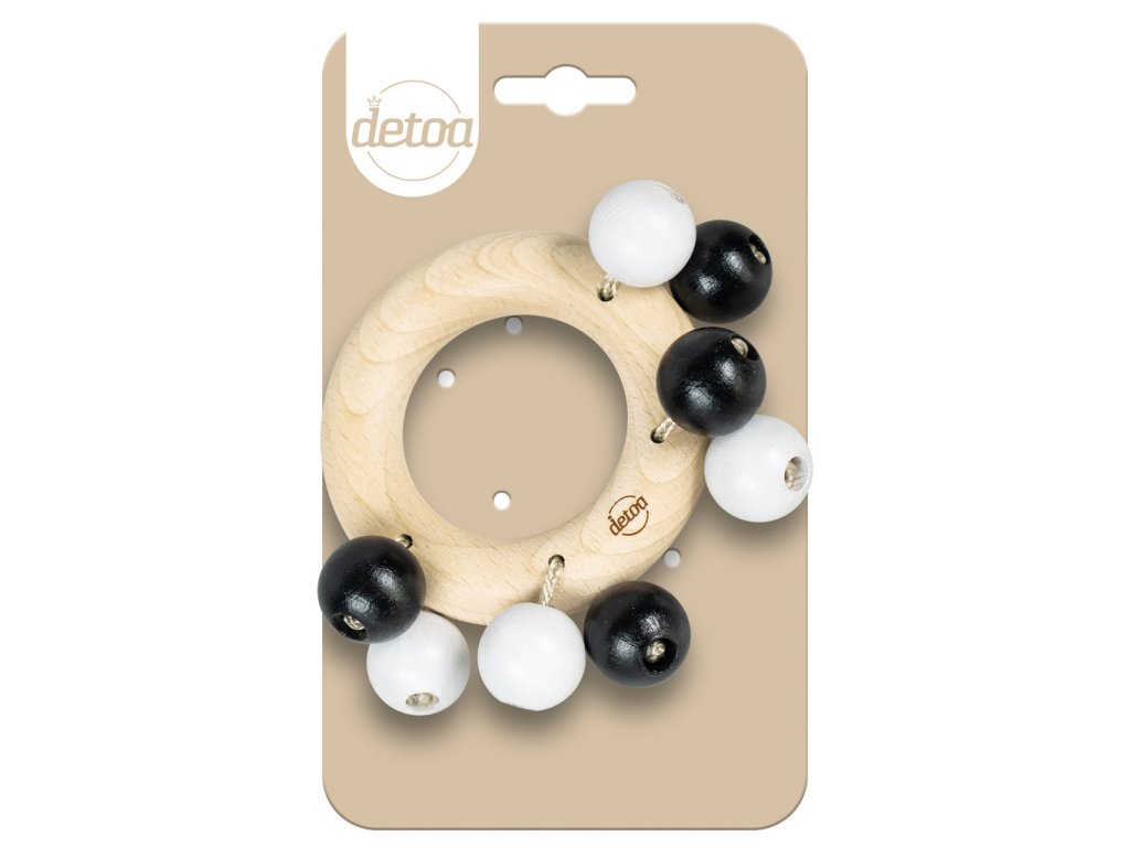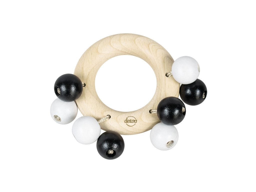 Dřevěné lehké chrastítko s černobílými kuličkami na šňůrce pomáhá rozvíjet jemnou motoriku rukou a je vhodné pro děti od 6ti měsíců. Výrobek splňuje požadavky EU na bezpečnost hraček. Průměr kroužku je 7 cm a je připevněn na ekologické papírové kartě. Hlavní vlastnosti: procvičuje jemnou motorikuvýrobek je zdravotně nezávadnýsplňuje všechny normy EU pro bezpečnost hračekprůměr kroužku je 7 cm a je připevněn na papírové kartěvyrobeno v České republice