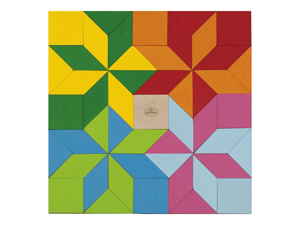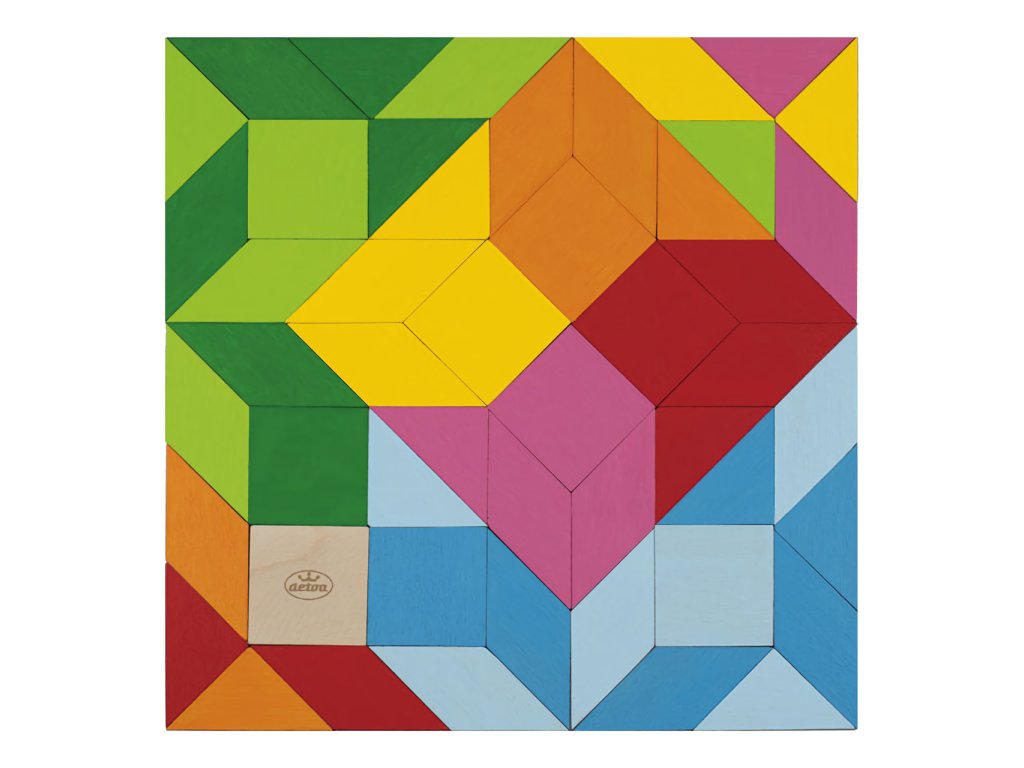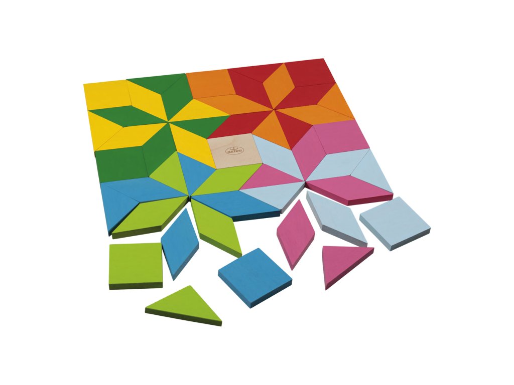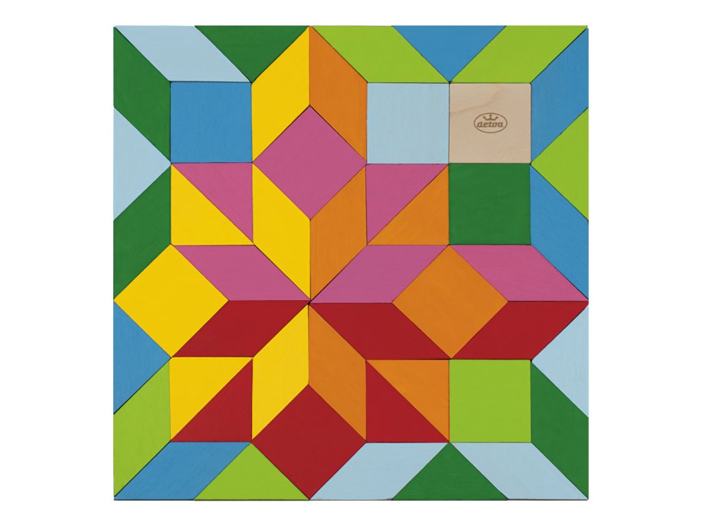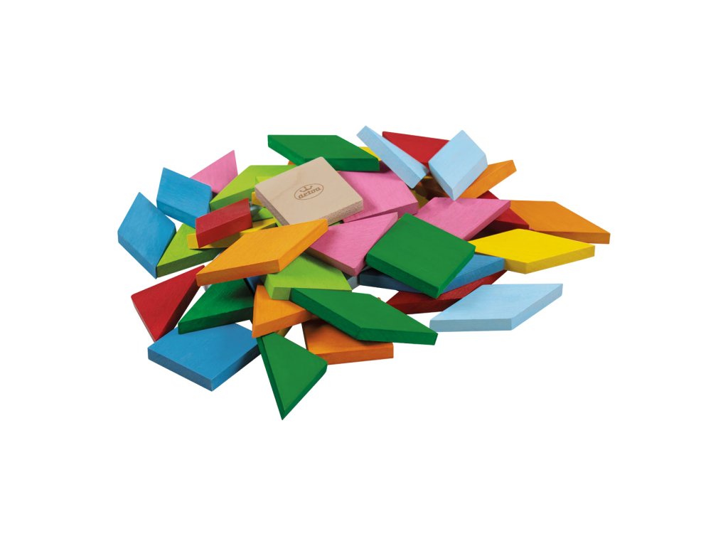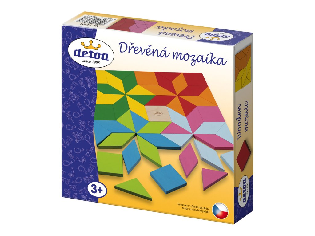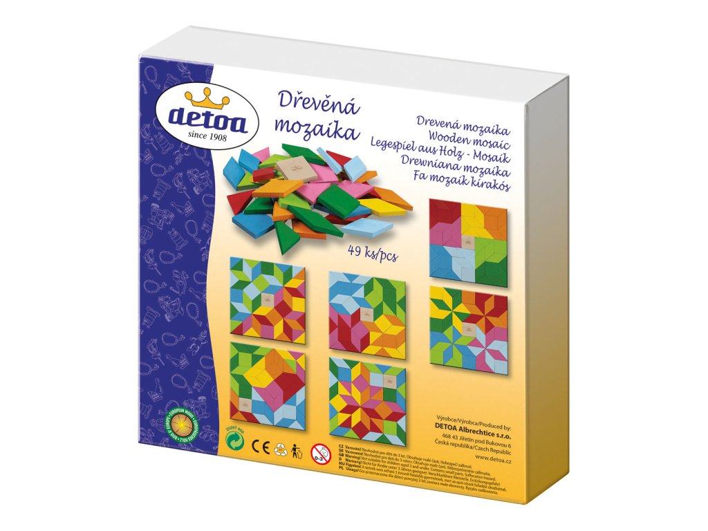 Obsahuje: 49 dřevěných kamenů, 4 papírové vzory mozaiky